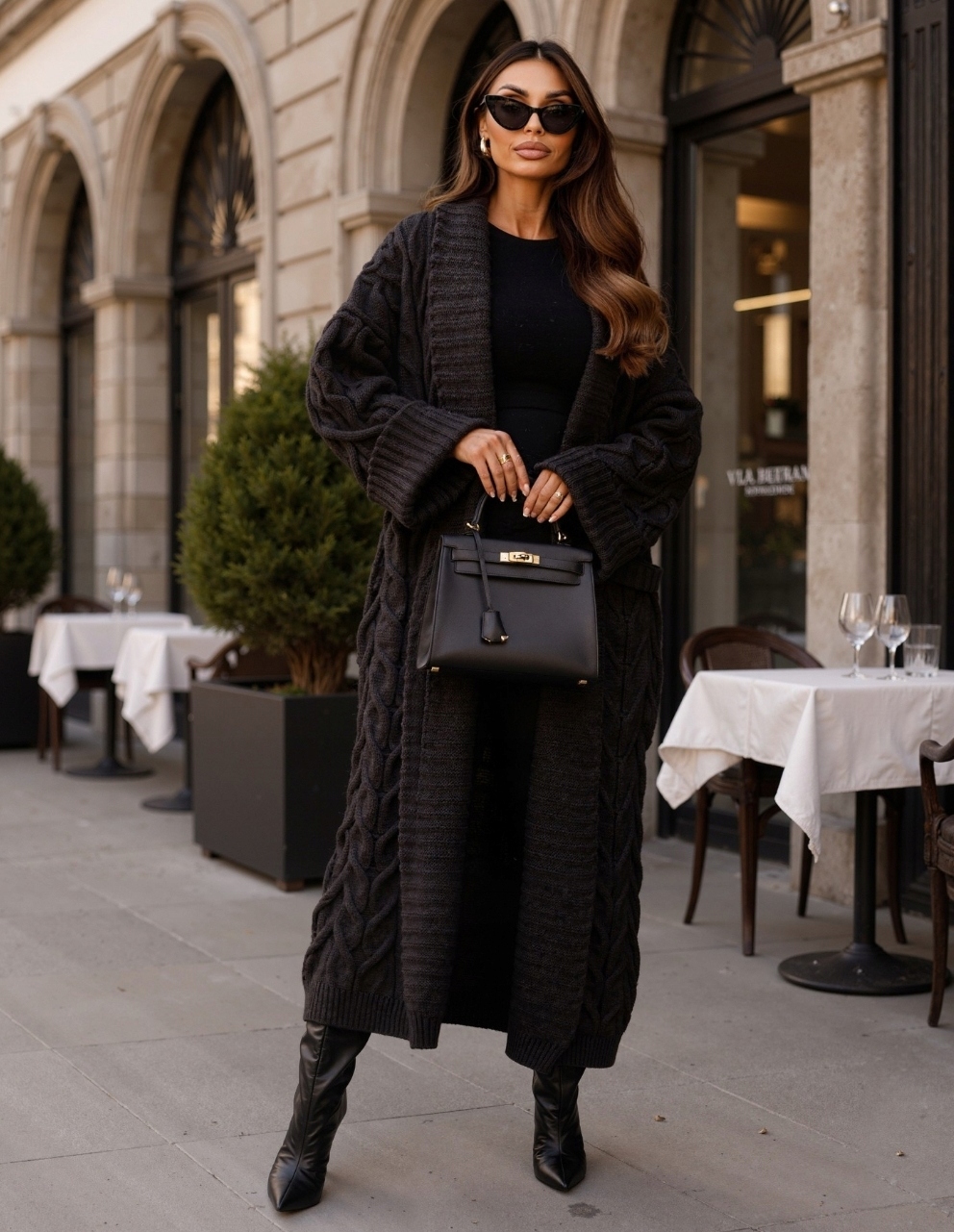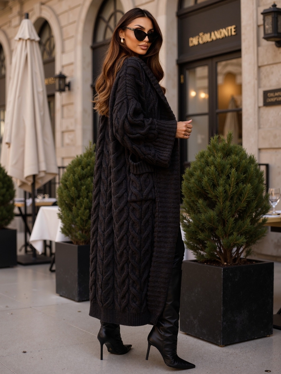 DŁUGI KARDIGAN PLECIONY – CIEPŁY ELEGANCKI SWETER DO KOSTEK
