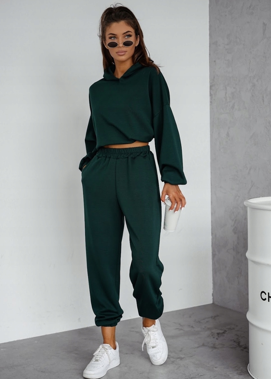 Spodnie wyposażone są w elastyczną gumkę w pasie, praktyczne kieszenie oraz ściągacze przy kostkach, które nadają całości sportowego, a jednocześnie stylowego charakteru.