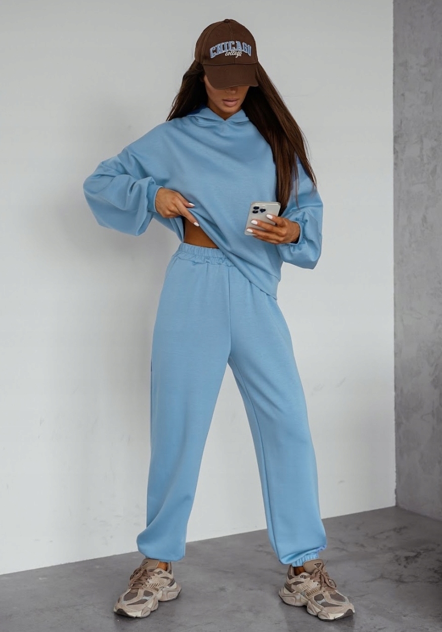 Spodnie wyposażone są w elastyczną gumkę w pasie, praktyczne kieszenie oraz ściągacze przy kostkach, które nadają całości sportowego, a jednocześnie stylowego charakteru.