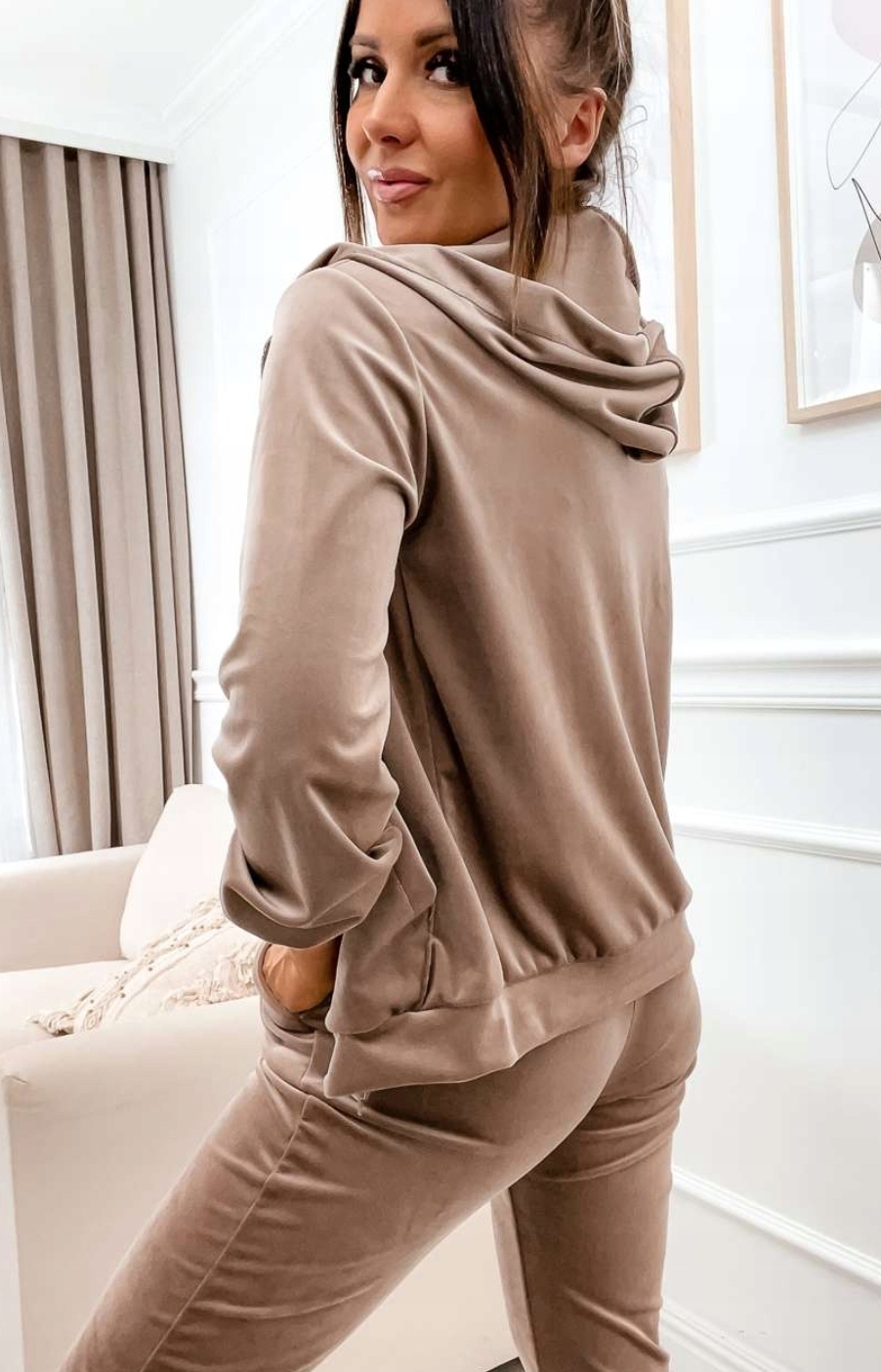 Damski komplet dresowy welurowy – klasyczny i niezwykle wygodny. Bluza na suwak z kapturem i kieszeniami oraz spodnie z praktycznymi kieszeniami i szeroką gumą w pasie. Wysoka jakość od polskiego producenta. Idealny na co dzień!