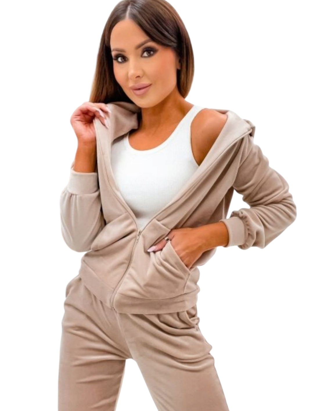 Damski komplet dresowy welurowy – klasyczny i niezwykle wygodny. Bluza na suwak z kapturem i kieszeniami oraz spodnie z praktycznymi kieszeniami i szeroką gumą w pasie. Wysoka jakość od polskiego producenta. Idealny na co dzień!