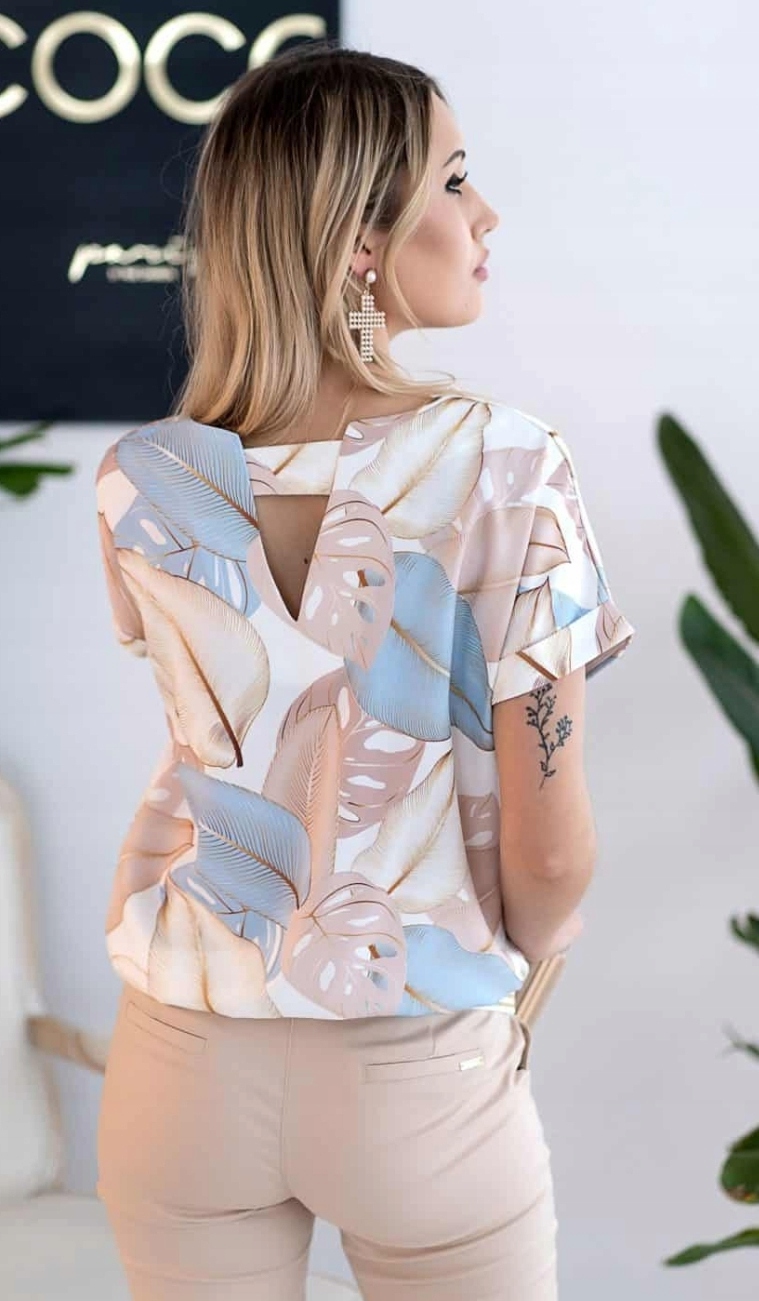 Bluzka z ozdobnym wycięciem na plecach o pięknej delikatnej kolorystyce, która wspaniale sprawdzi się w wielu codziennych jak i okazjonalnych stylizacjach. Produkt posiada okrągły dekolt. Dół bluzki zakończony ozdobną gumką. Z pewnością będzie pasować zarówno do jeansów, jak i do cygaretek czy ołówkowej spódnicy. Zdecydowanie jest to górna półka z kategorii bluzki, Polski producent który szyje z dbałością o najmniejsze szczegóły i detale. Produkt Polski.