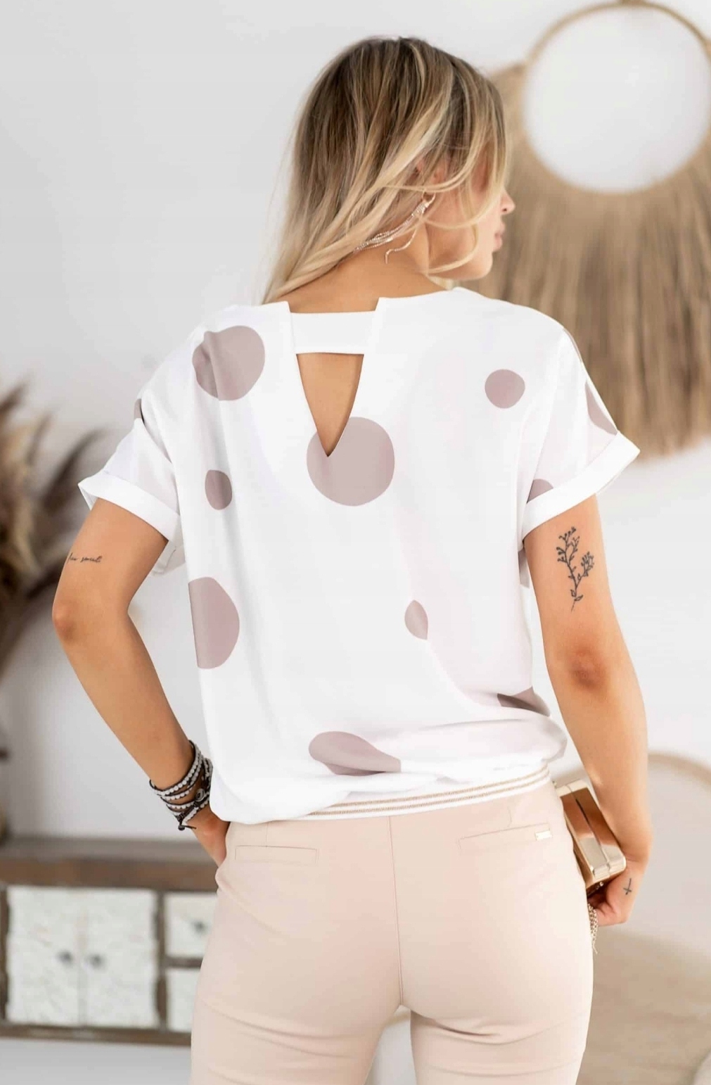 Bluzka z ozdobnym wycięciem na plecach o pięknej delikatnej kolorystyce, która wspaniale sprawdzi się w wielu codziennych jak i okazjonalnych stylizacjach. Produkt posiada okrągły dekolt. Dół bluzki zakończony ozdobną gumką. Z pewnością będzie pasować zarówno do jeansów, jak i do cygaretek czy ołówkowej spódnicy. Zdecydowanie jest to górna półka z kategorii bluzki, Polski producent który szyje z dbałością o najmniejsze szczegóły i detale. Produkt Polski.