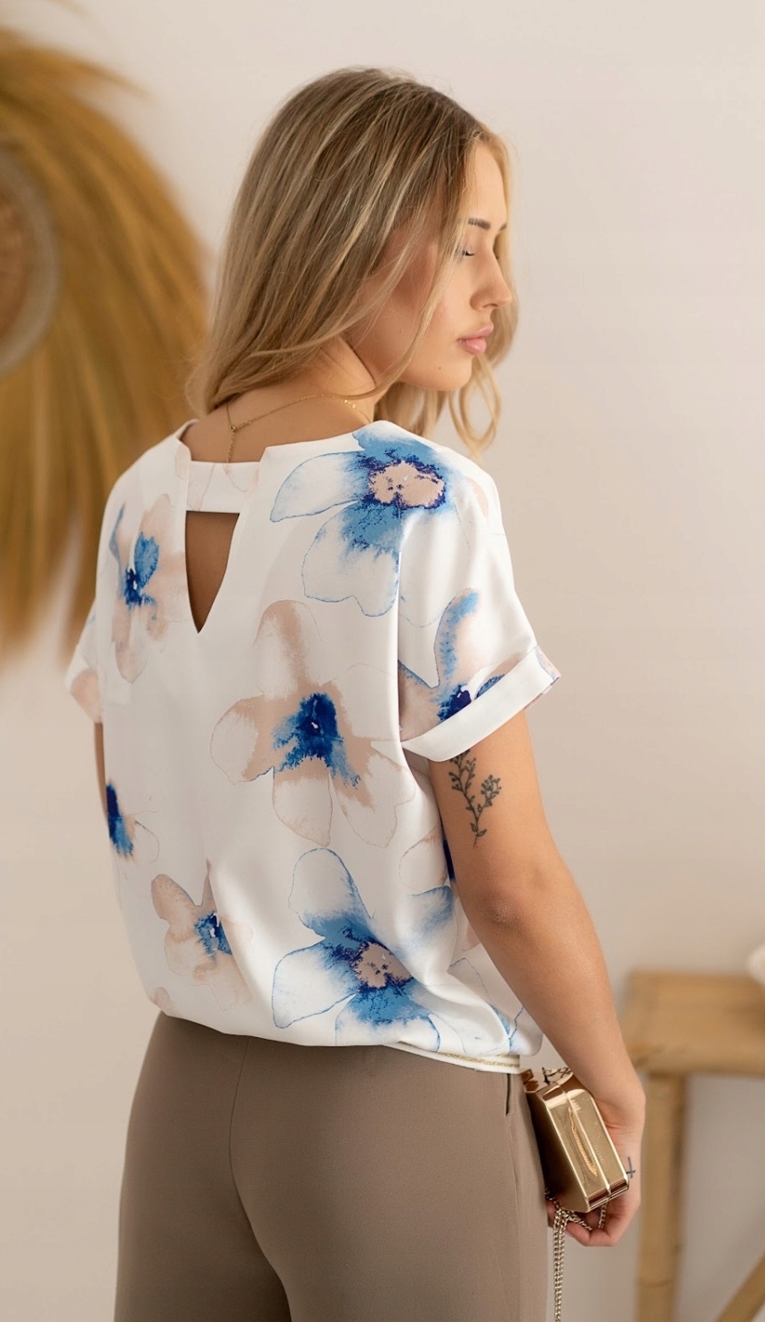 Bluzka z ozdobnym wycięciem na plecach o pięknej delikatnej kolorystyce, która wspaniale sprawdzi się w wielu codziennych jak i okazjonalnych stylizacjach. Produkt posiada okrągły dekolt. Dół bluzki zakończony ozdobną gumką. Z pewnością będzie pasować zarówno do jeansów, jak i do cygaretek czy ołówkowej spódnicy. Zdecydowanie jest to górna półka z kategorii bluzki, Polski producent który szyje z dbałością o najmniejsze szczegóły i detale. Produkt Polski.
