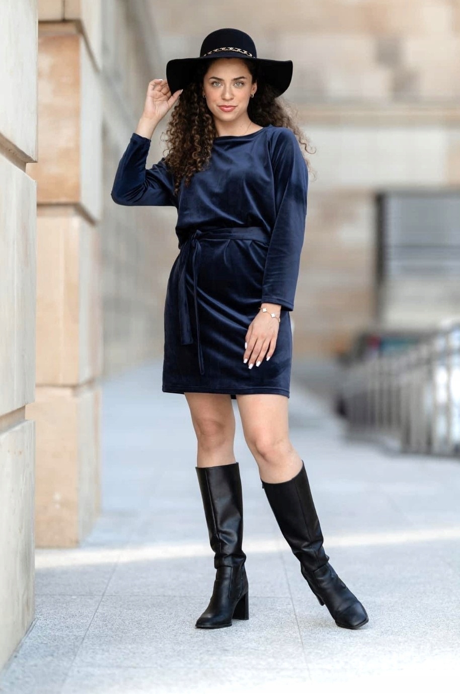 Elegancka sukienka welurowa, która łączy klasykę z nowoczesnym stylem. Góra sukienki jest luźna, zapewniając komfort i swobodę, podczas gdy dół delikatnie dopasowuje się do sylwetki, podkreślając jej kształty. Sukienka ma długość przed kolano, co sprawia, że jest idealna na różnorodne okazje. W pasie znajduje się subtelne wiązanie, które pozwala na regulację i dodatkowe zaakcentowanie talii. Wykonana z wysokiej jakości weluru, materiał jest przyjemny w dotyku, elastyczny i doskonale układa się na ciele, gwarantując wygodę przez cały dzień. Idealna na wieczorne wyjścia, spotkania ,czy codzienne stylizacje, ta sukienka to must-have w każdej garderobie.