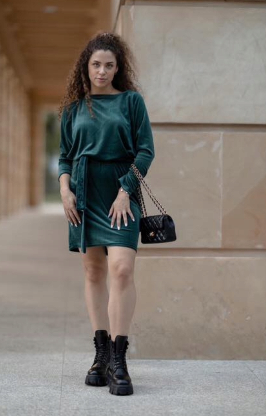 Elegancka sukienka welurowa, która łączy klasykę z nowoczesnym stylem. Góra sukienki jest luźna, zapewniając komfort i swobodę, podczas gdy dół delikatnie dopasowuje się do sylwetki, podkreślając jej kształty. Sukienka ma długość przed kolano, co sprawia, że jest idealna na różnorodne okazje. W pasie znajduje się subtelne wiązanie, które pozwala na regulację i dodatkowe zaakcentowanie talii. Wykonana z wysokiej jakości weluru, materiał jest przyjemny w dotyku, elastyczny i doskonale układa się na ciele, gwarantując wygodę przez cały dzień. Idealna na wieczorne wyjścia, spotkania ,czy codzienne stylizacje, ta sukienka to must-have w każdej garderobie.