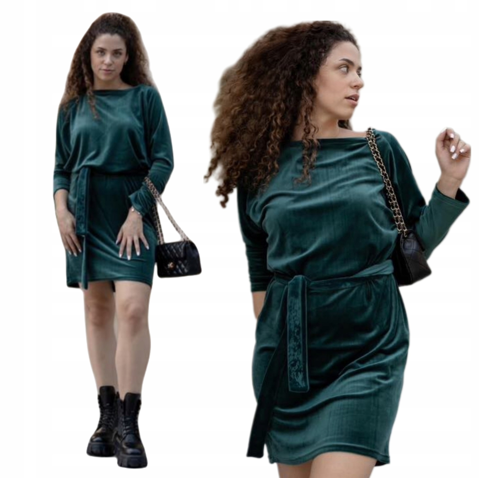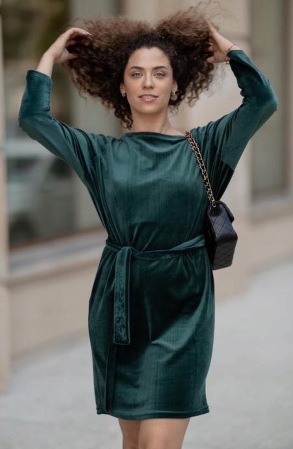 Elegancka sukienka welurowa, która łączy klasykę z nowoczesnym stylem. Góra sukienki jest luźna, zapewniając komfort i swobodę, podczas gdy dół delikatnie dopasowuje się do sylwetki, podkreślając jej kształty. Sukienka ma długość przed kolano, co sprawia, że jest idealna na różnorodne okazje. W pasie znajduje się subtelne wiązanie, które pozwala na regulację i dodatkowe zaakcentowanie talii. Wykonana z wysokiej jakości weluru, materiał jest przyjemny w dotyku, elastyczny i doskonale układa się na ciele, gwarantując wygodę przez cały dzień. Idealna na wieczorne wyjścia, spotkania ,czy codzienne stylizacje, ta sukienka to must-have w każdej garderobie.