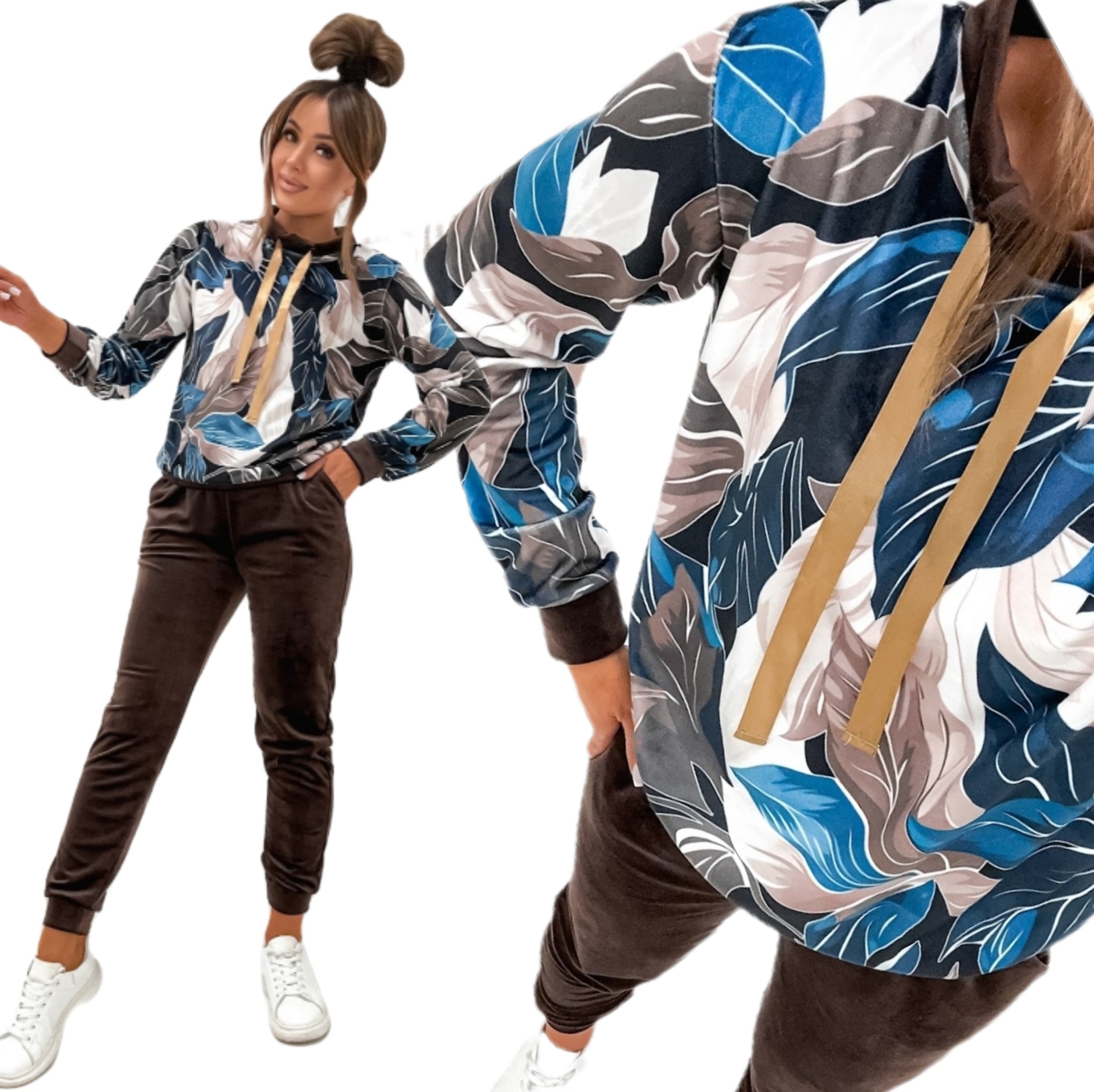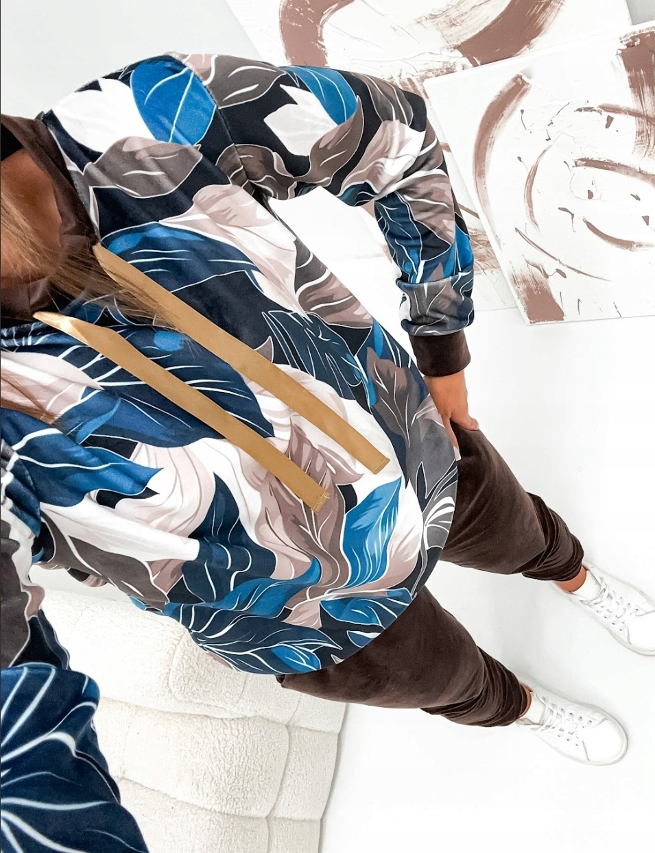 Stylowy, a zarazem wygodny komplet dresowy, który doskonale łączy komfort noszenia z eleganckim wyglądem. Bluza wkładana przez głowę, wykończona lekką stójką, przez którą przeciągnięta jest subtelna, satynowa wstążka – to modny akcent, który nadaje całości wyjątkowego charakteru. Wzorzysta tkanina z motywem liści przyciąga uwagę i sprawia, że dres wyróżnia się na tle klasycznych modeli.