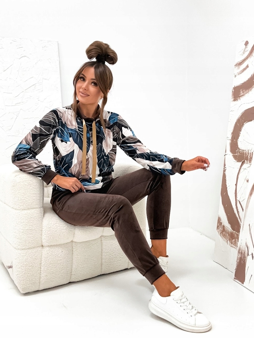 Stylowy, a zarazem wygodny komplet dresowy, który doskonale łączy komfort noszenia z eleganckim wyglądem. Bluza wkładana przez głowę, wykończona lekką stójką, przez którą przeciągnięta jest subtelna, satynowa wstążka – to modny akcent, który nadaje całości wyjątkowego charakteru. Wzorzysta tkanina z motywem liści przyciąga uwagę i sprawia, że dres wyróżnia się na tle klasycznych modeli.