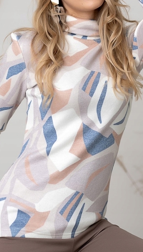 Elegancki golf sweter damski/bluzka sweterkowa uszyta z polskiej, certyfikowanej, dzianiny najlepszej jakości. Pod szyją delikatny golf który również można skrócić poprzez wywinięcie, a całość zdobi przepiękny kobiecy subtelny print. Sweterek jest dość ciepły- doskonale układa się do sylwetki, idealny na obecny czas. Zdecydowanie jest to górna półka z kategorii swetry, Polski producent który szyje z dbałością o najmniejsze szczegóły i detale.