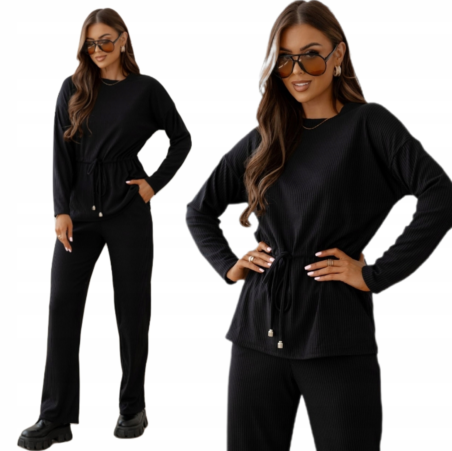 Elegancki komplet dresowy uszyty z wysokogatunkowej, miękkiej bawełny o delikatnym, widocznym prążku. Luźna bluza o swobodnym kroju została wzbogacona o regulowany sznureczek w talii, zakończony ozdobnym troczkiem – subtelny detal, który podkreśla sylwetkę i dodaje całości kobiecego charakteru. Spodnie o szerokim fasonie zapewniają wygodę i swobodę ruchów, a elastyczna guma w pasie oraz praktyczne kieszenie czynią je niezwykle funkcjonalnymi. Idealny zestaw na co dzień, który łączy modny wygląd z komfortem noszenia.