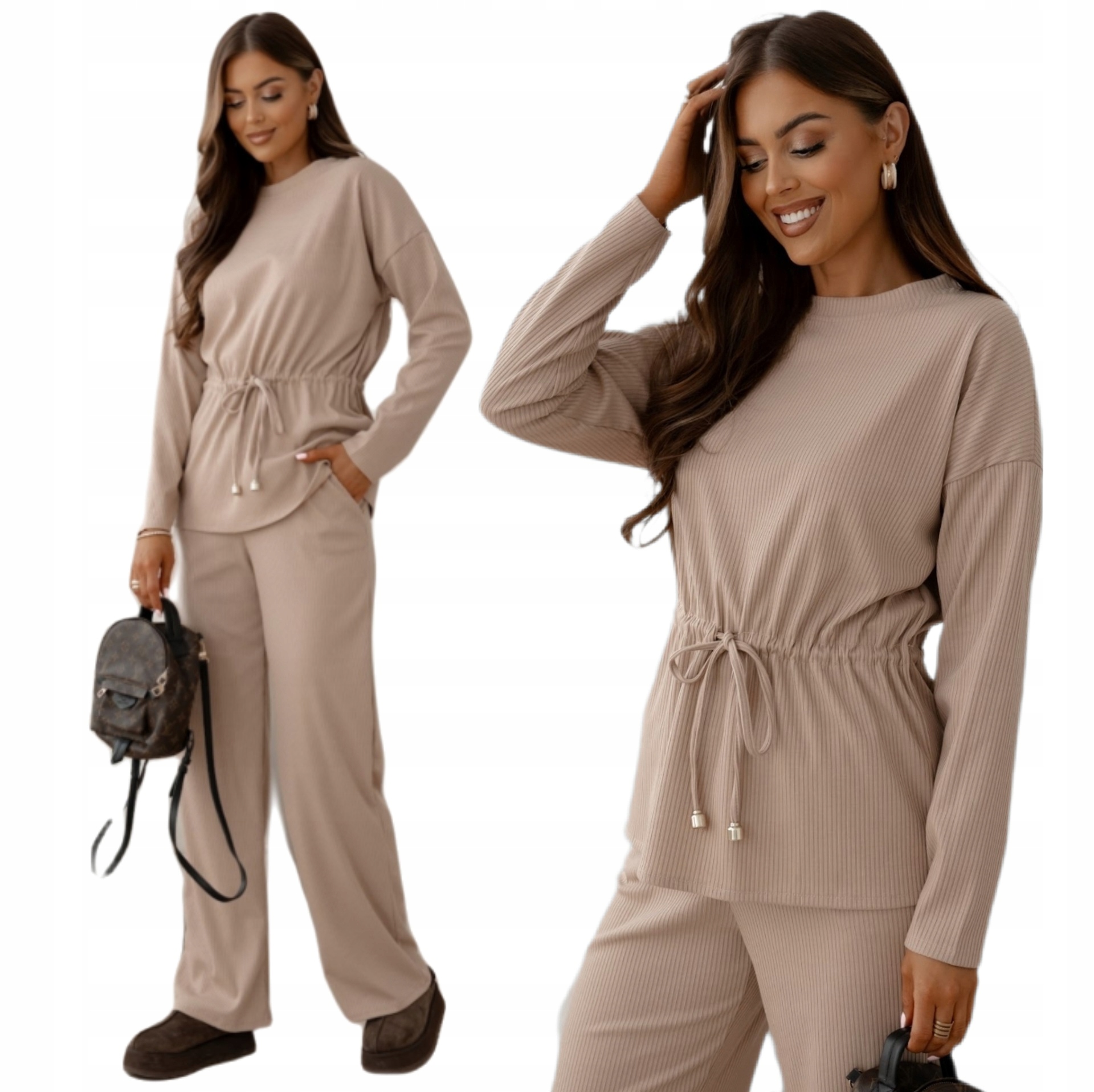 Elegancki komplet dresowy uszyty z wysokogatunkowej, miękkiej bawełny o delikatnym, widocznym prążku. Luźna bluza o swobodnym kroju została wzbogacona o regulowany sznureczek w talii, zakończony ozdobnym troczkiem – subtelny detal, który podkreśla sylwetkę i dodaje całości kobiecego charakteru. Spodnie o szerokim fasonie zapewniają wygodę i swobodę ruchów, a elastyczna guma w pasie oraz praktyczne kieszenie czynią je niezwykle funkcjonalnymi. Idealny zestaw na co dzień, który łączy modny wygląd z komfortem noszenia.
