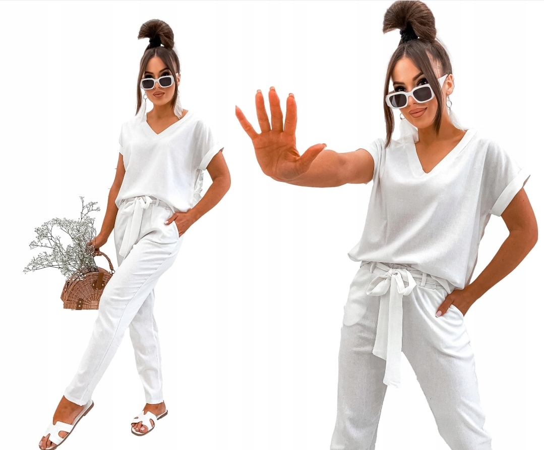 Komplet składa się z bluzki w serek i spodni. Bluzka posiada delikatne mankiety przy rękawach, spodnie z wysokim stanem, w pasie guma z ozdobnym marszczeniem oraz szlufki do załączonego paska, w zestawie długi lniany pasek który można zawiązać w dowolny sposób.