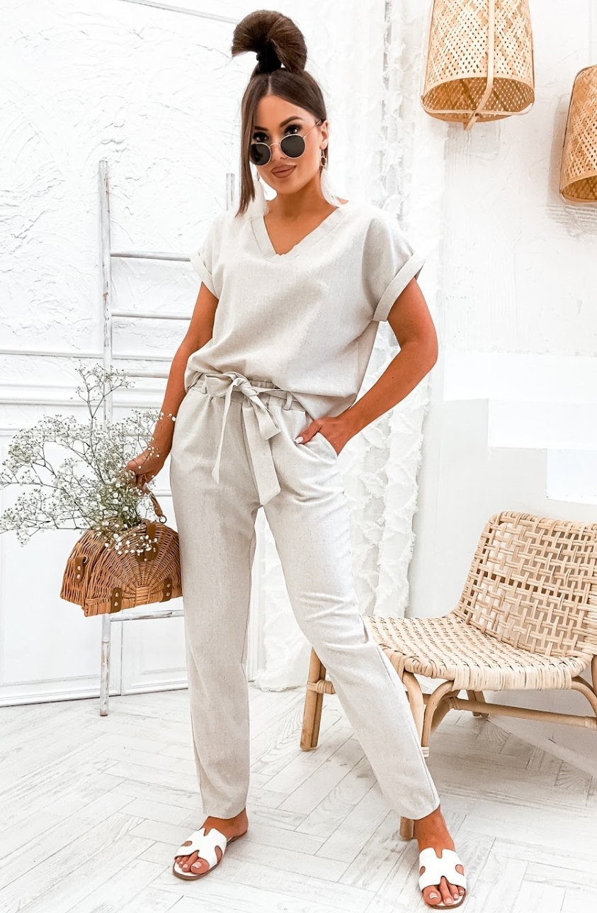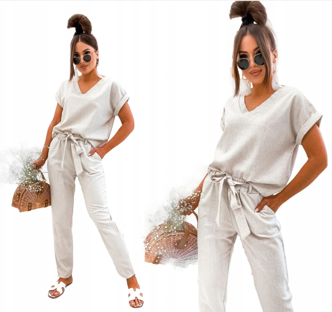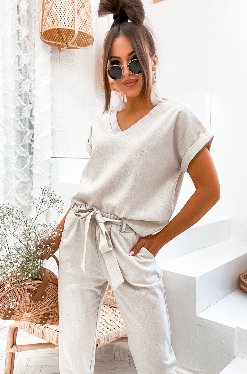 Komplet składa się z bluzki w serek i spodni. Bluzka posiada delikatne mankiety przy rękawach, spodnie z wysokim stanem, w pasie guma z ozdobnym marszczeniem oraz szlufki do załączonego paska, w zestawie długi lniany pasek który można zawiązać w dowolny sposób.
