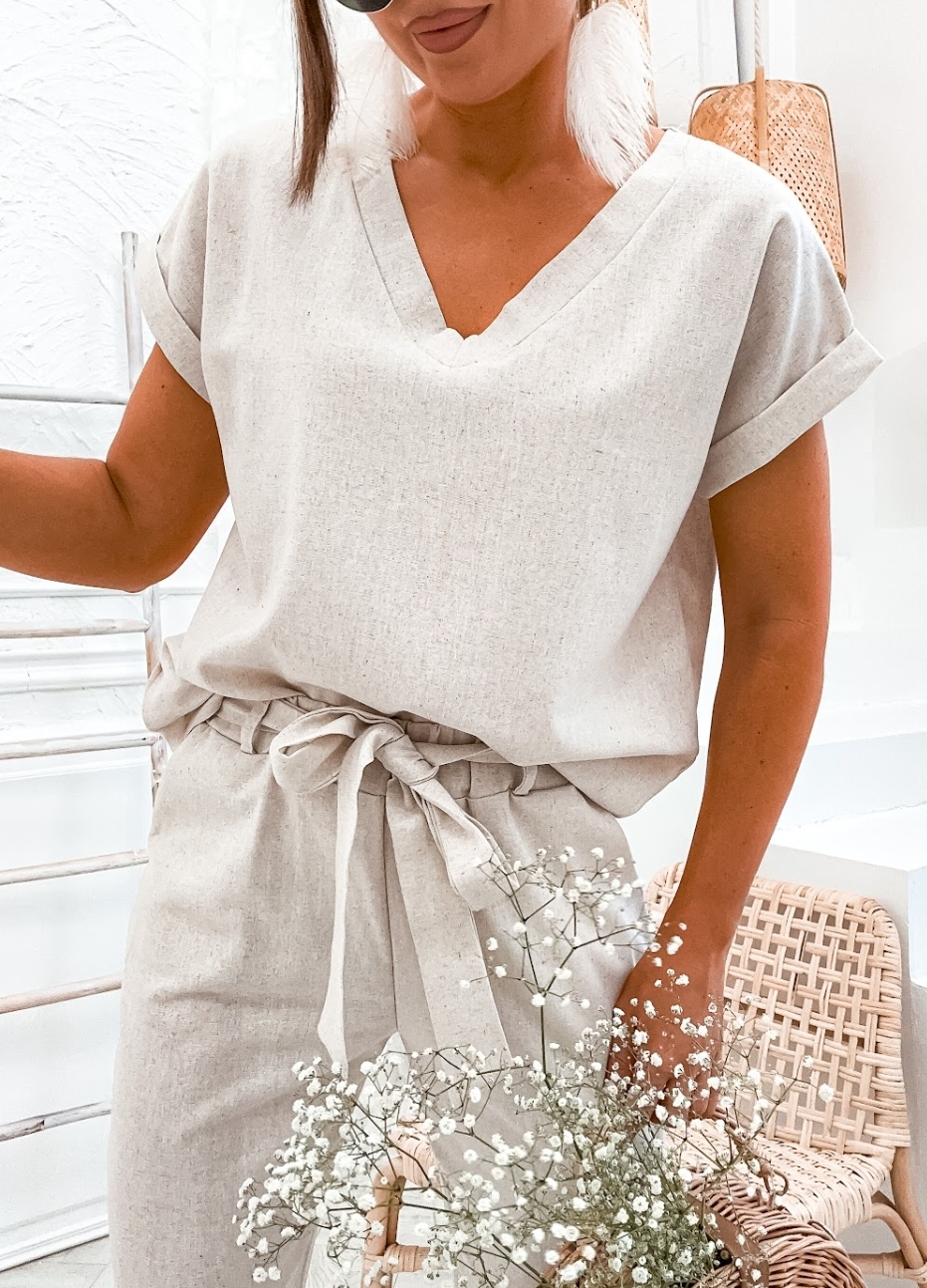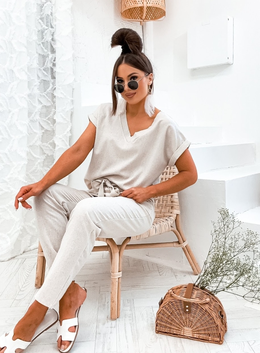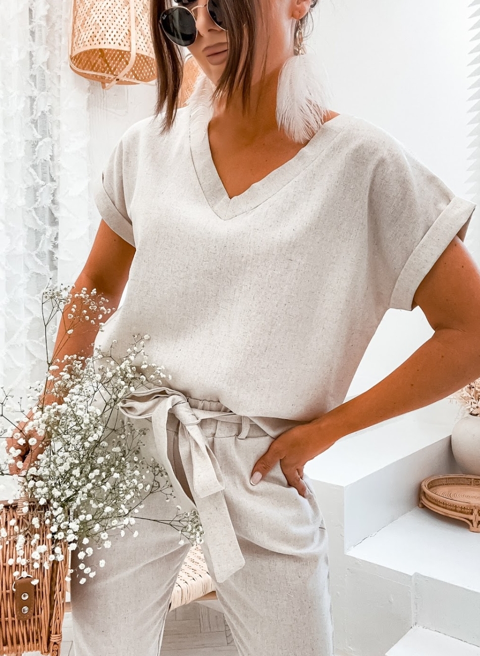 Komplet składa się z bluzki w serek i spodni. Bluzka posiada delikatne mankiety przy rękawach, spodnie z wysokim stanem, w pasie guma z ozdobnym marszczeniem oraz szlufki do załączonego paska, w zestawie długi lniany pasek który można zawiązać w dowolny sposób.