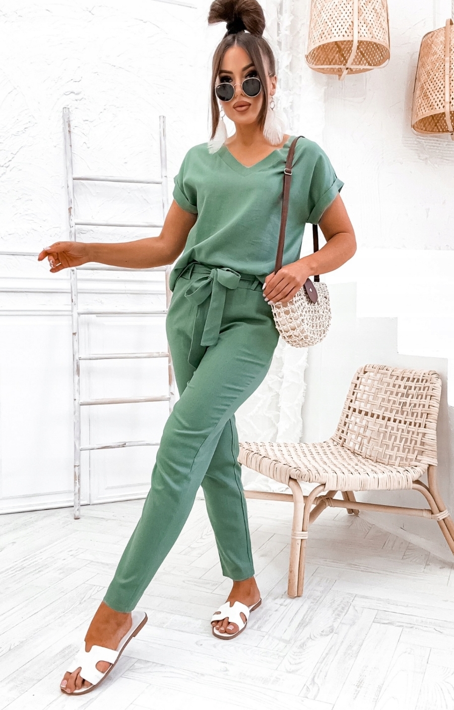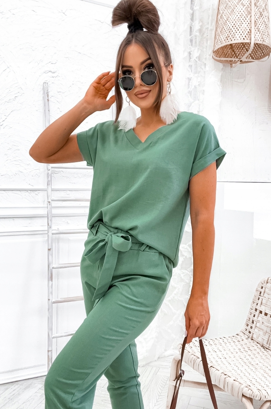 Komplet składa się z bluzki w serek i spodni. Bluzka posiada delikatne mankiety przy rękawach, spodnie z wysokim stanem, w pasie guma z ozdobnym marszczeniem oraz szlufki do załączonego paska, w zestawie długi lniany pasek który można zawiązać w dowolny sposób.