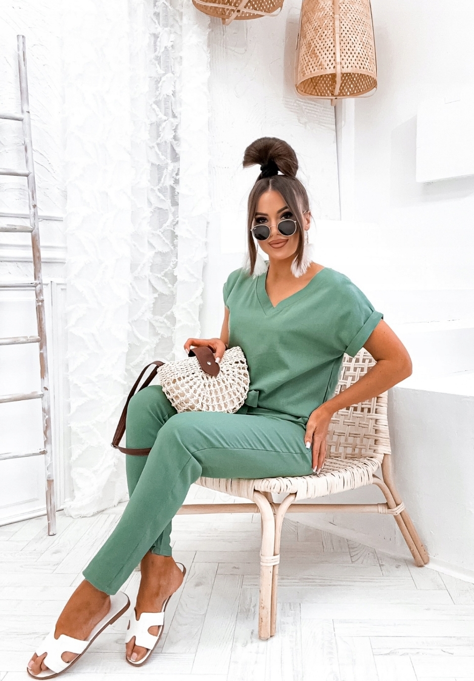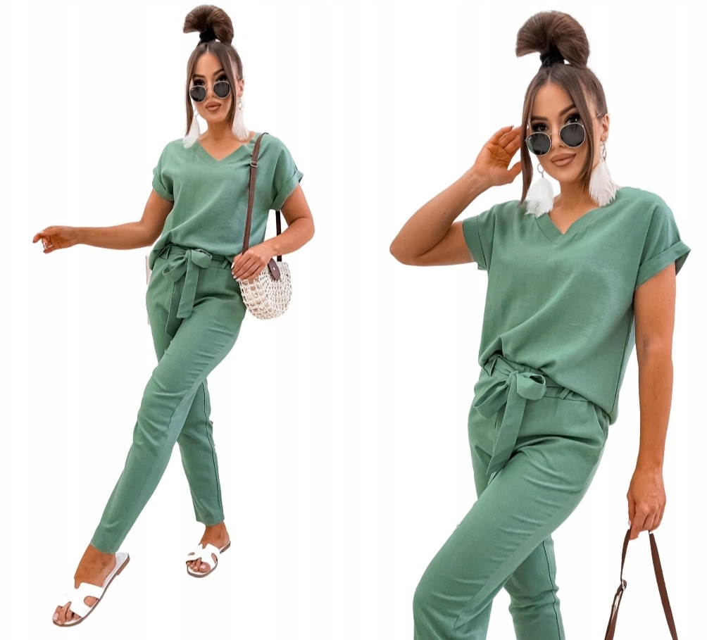 Komplet składa się z bluzki w serek i spodni. Bluzka posiada delikatne mankiety przy rękawach, spodnie z wysokim stanem, w pasie guma z ozdobnym marszczeniem oraz szlufki do załączonego paska, w zestawie długi lniany pasek który można zawiązać w dowolny sposób.