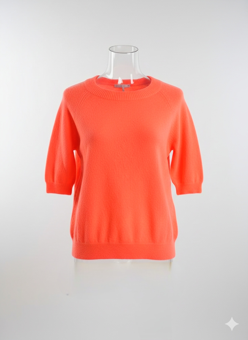 Elegancki Włoski sweterek z najwyższej jakości baby alpaki. Lekki, miękki i przyjemny w dotyku materiał zapewnia komfort noszenia przez cały dzień. Krótki rękaw oraz okrągły dekolt sprawiają, że jest to idealny wybór na cieplejsze dni. Sweterek jest elastyczny, świetnie dopasowuje się do sylwetki, a żywy kolor dodaje energii i świeżości każdej stylizacji.