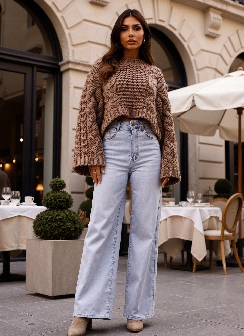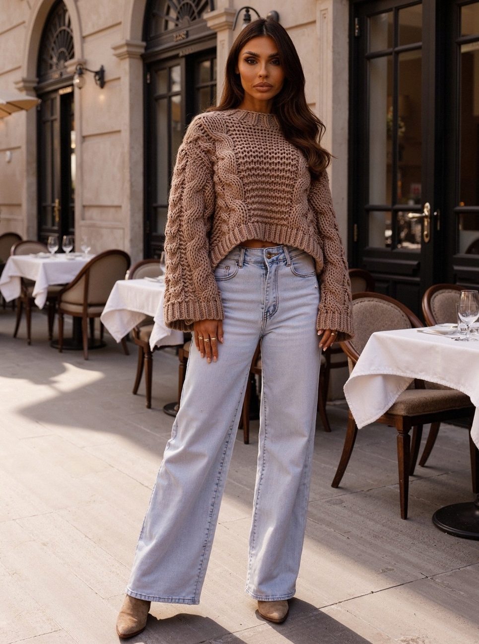 Sweter ma krótszy, nowoczesny krój i szerokie rękawy, które dodają mu charakteru i modnego, oversize’owego looku.