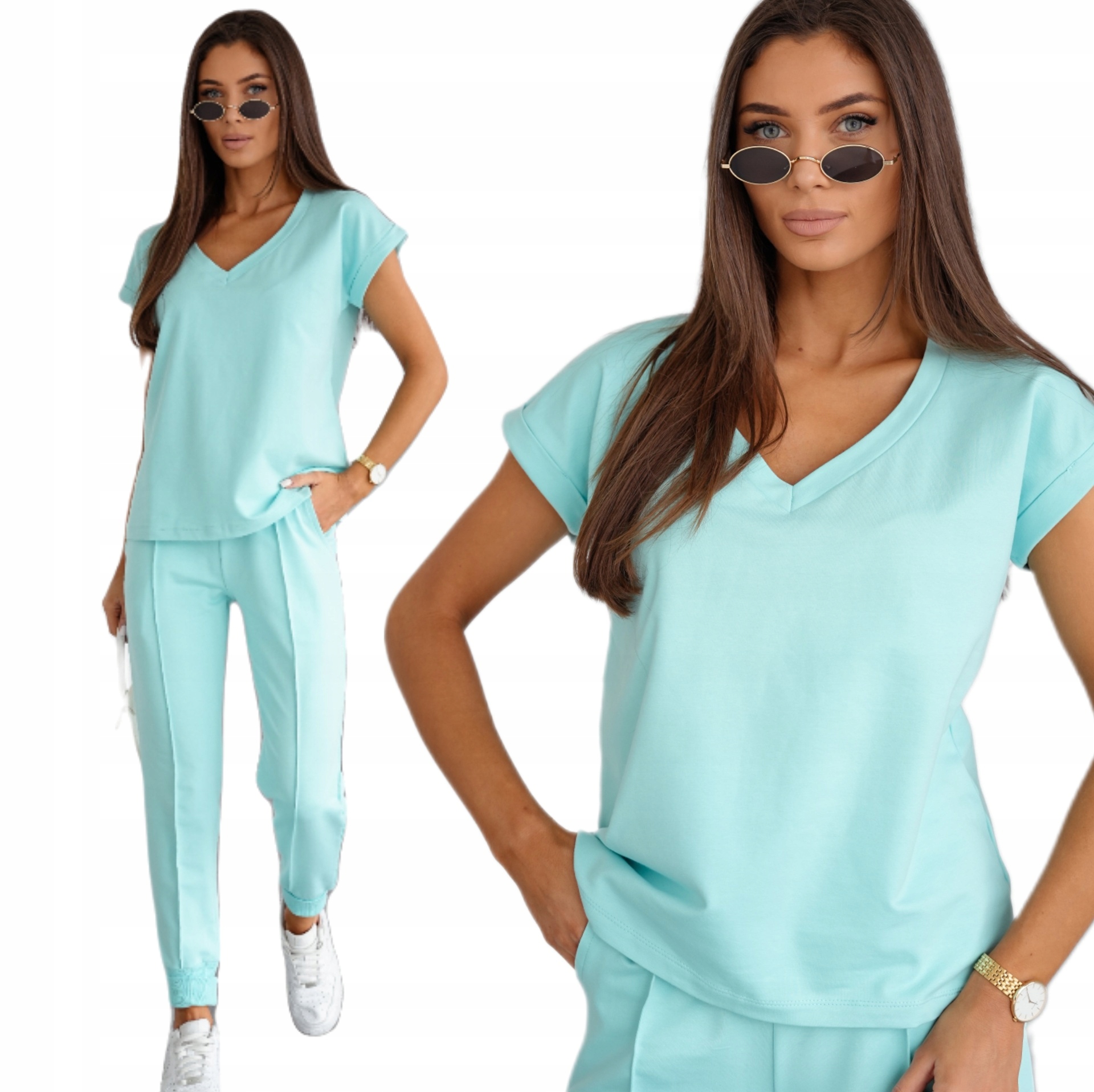 Komplet składający się z bluzki z krótkim rękawem i dekoltem w literę V oraz spodni o jednolitej kolorystyce. Bez wątpienia świetnie sprawdzi się w wielu codziennych stylizacjach. Kieszonki oraz gumka w pasie podkreślają sportowy charakter zestawu, natomiast przyjemny, lekki materiał sprawia, że jest on niezwykle wygodny i świetnie się nosi. To świetna propozycja na co dzień, na spotkanie ze znajomymi czy wiosenne wyjście na miasto.