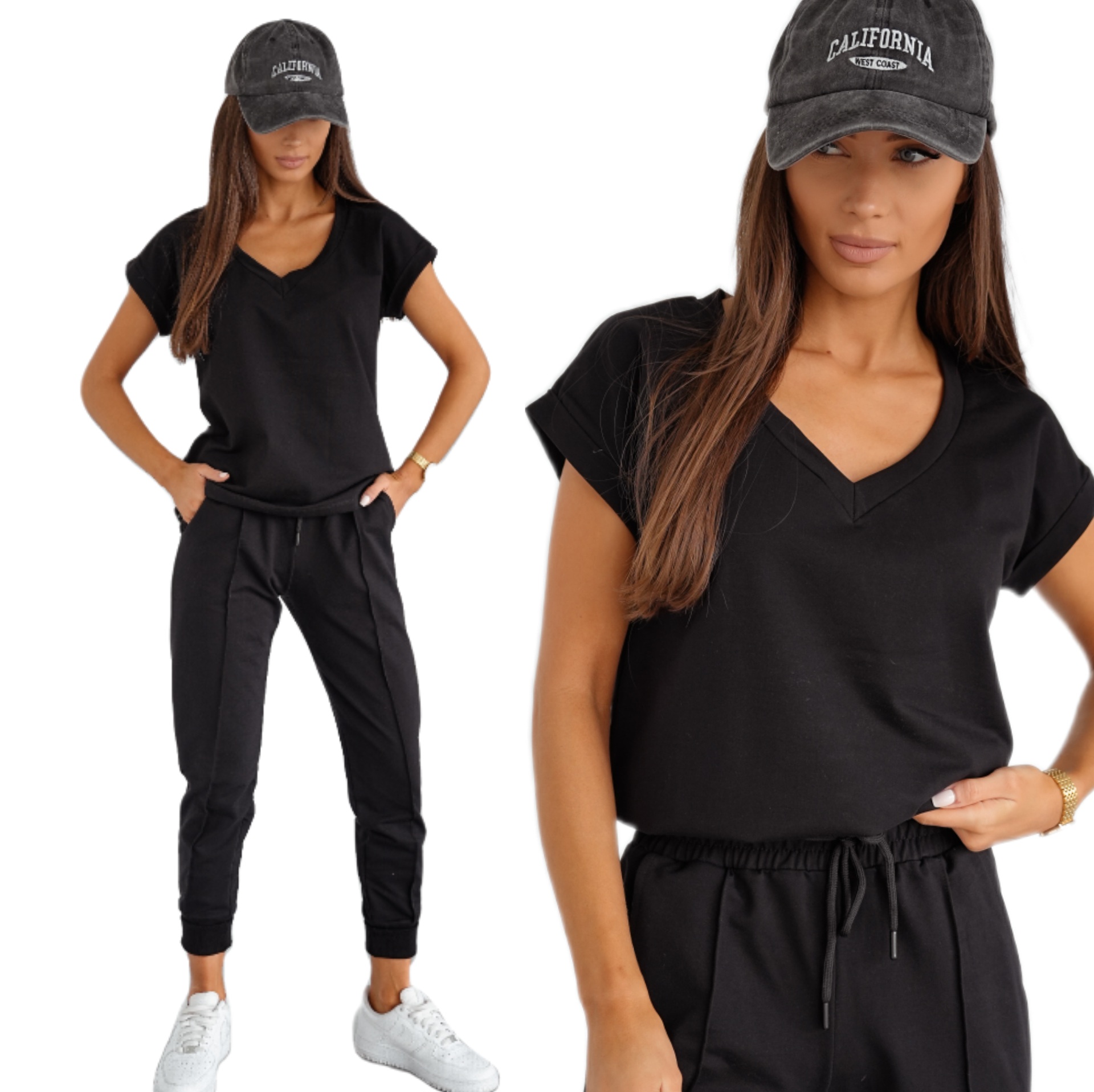 Komplet składający się z bluzki z krótkim rękawem i dekoltem w literę V oraz spodni o jednolitej kolorystyce. Bez wątpienia świetnie sprawdzi się w wielu codziennych stylizacjach. Kieszonki oraz gumka w pasie podkreślają sportowy charakter zestawu, natomiast przyjemny, lekki materiał sprawia, że jest on niezwykle wygodny i świetnie się nosi. To świetna propozycja na co dzień, na spotkanie ze znajomymi czy wiosenne wyjście na miasto.