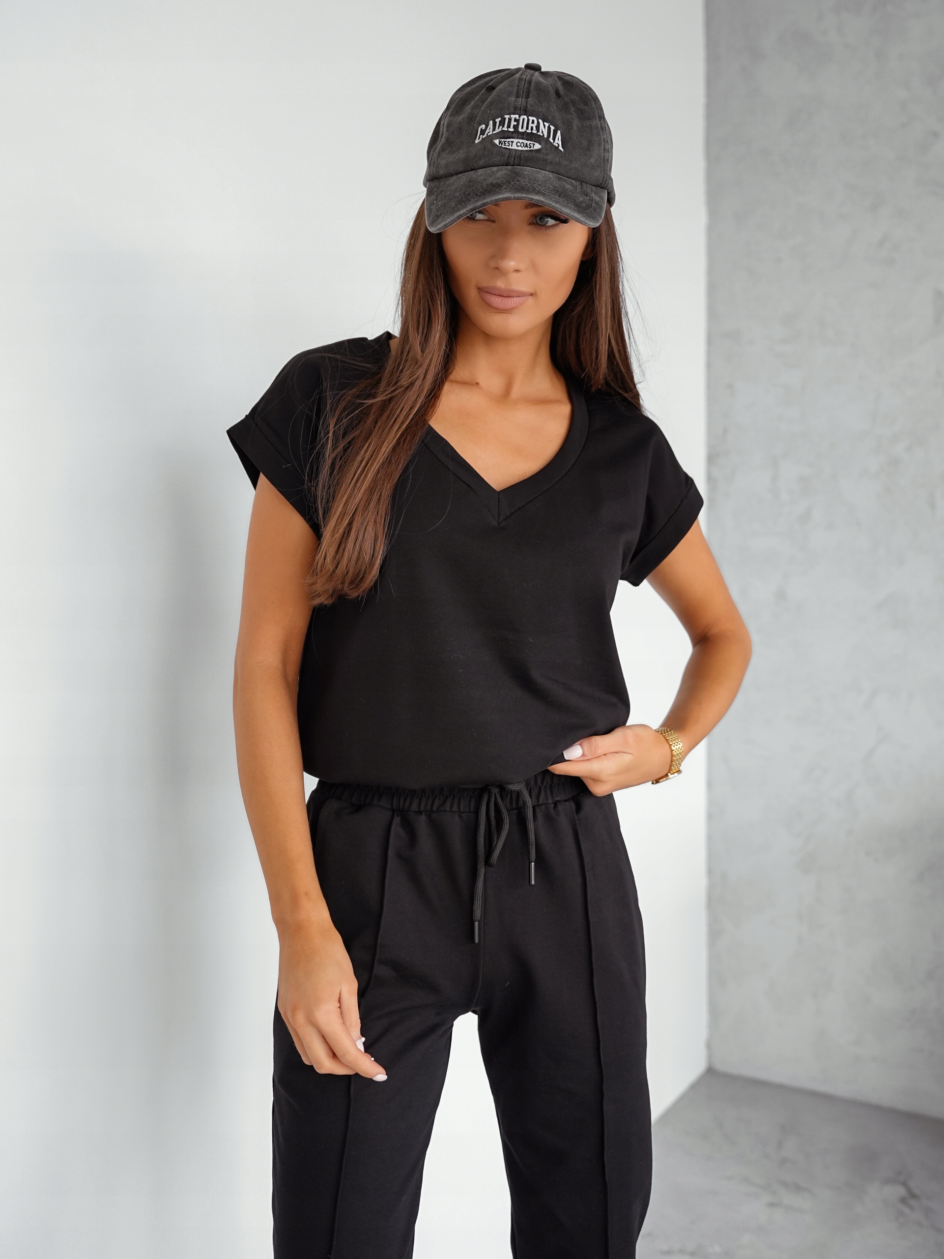 Komplet składający się z bluzki z krótkim rękawem i dekoltem w literę V oraz spodni o jednolitej kolorystyce. Bez wątpienia świetnie sprawdzi się w wielu codziennych stylizacjach. Kieszonki oraz gumka w pasie podkreślają sportowy charakter zestawu, natomiast przyjemny, lekki materiał sprawia, że jest on niezwykle wygodny i świetnie się nosi. To świetna propozycja na co dzień, na spotkanie ze znajomymi czy wiosenne wyjście na miasto.