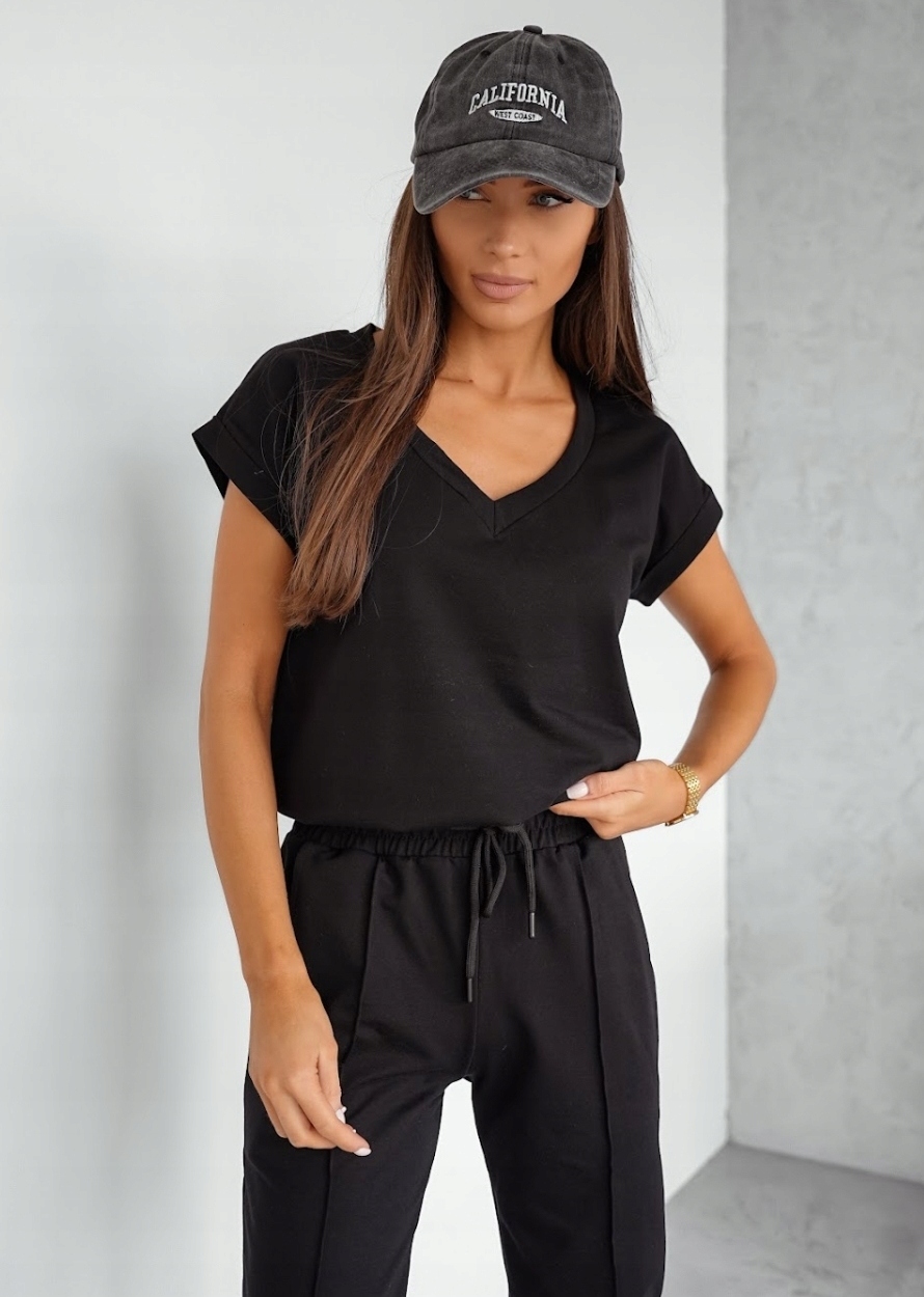 Komplet składający się z bluzki z krótkim rękawem i dekoltem w literę V oraz spodni o jednolitej kolorystyce. Bez wątpienia świetnie sprawdzi się w wielu codziennych stylizacjach. Kieszonki oraz gumka w pasie podkreślają sportowy charakter zestawu, natomiast przyjemny, lekki materiał sprawia, że jest on niezwykle wygodny i świetnie się nosi. To świetna propozycja na co dzień, na spotkanie ze znajomymi czy wiosenne wyjście na miasto.