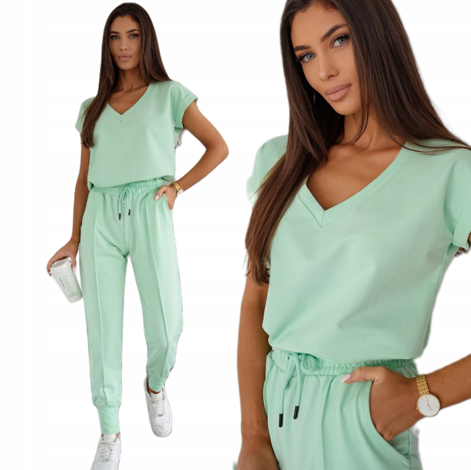 Komplet składający się z bluzki z krótkim rękawem i dekoltem w literę V oraz spodni o jednolitej kolorystyce. Bez wątpienia świetnie sprawdzi się w wielu codziennych stylizacjach. Kieszonki oraz gumka w pasie podkreślają sportowy charakter zestawu, natomiast przyjemny, lekki materiał sprawia, że jest on niezwykle wygodny i świetnie się nosi. To świetna propozycja na co dzień, na spotkanie ze znajomymi czy wiosenne wyjście na miasto.