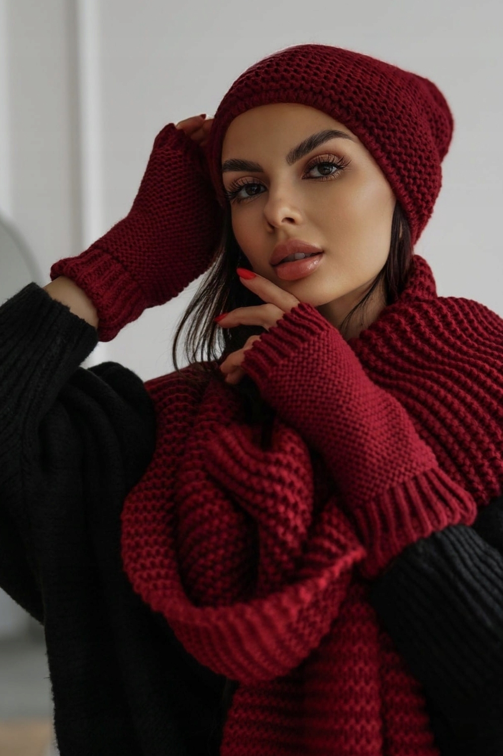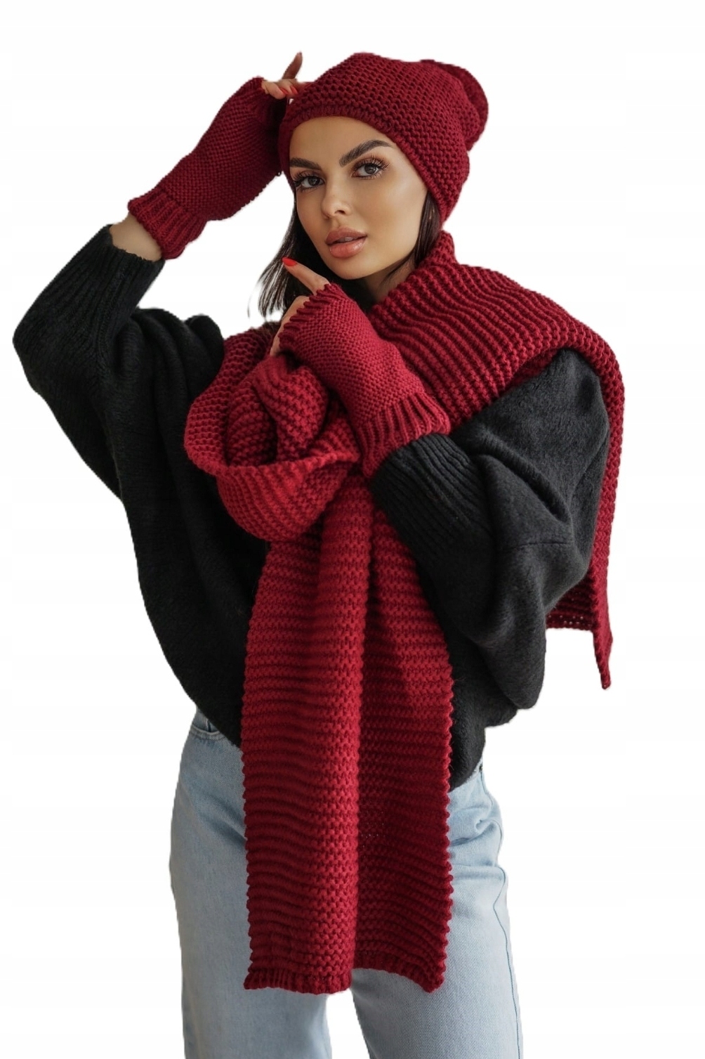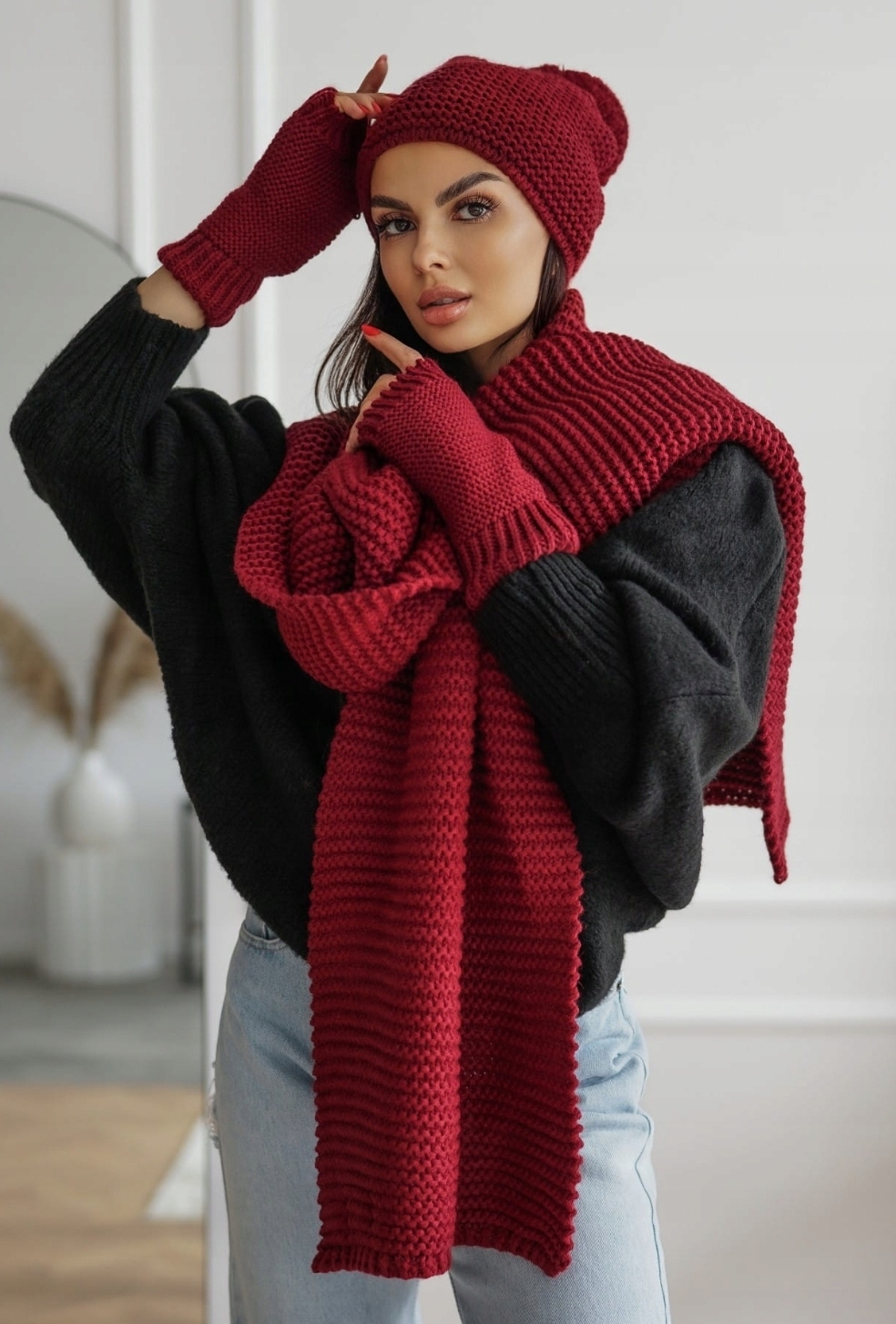 Zimowy komplet świetnie sprawdzi się w zestawienie ze skórzaną ramoneską, zimową kurtką lub płaszczem.