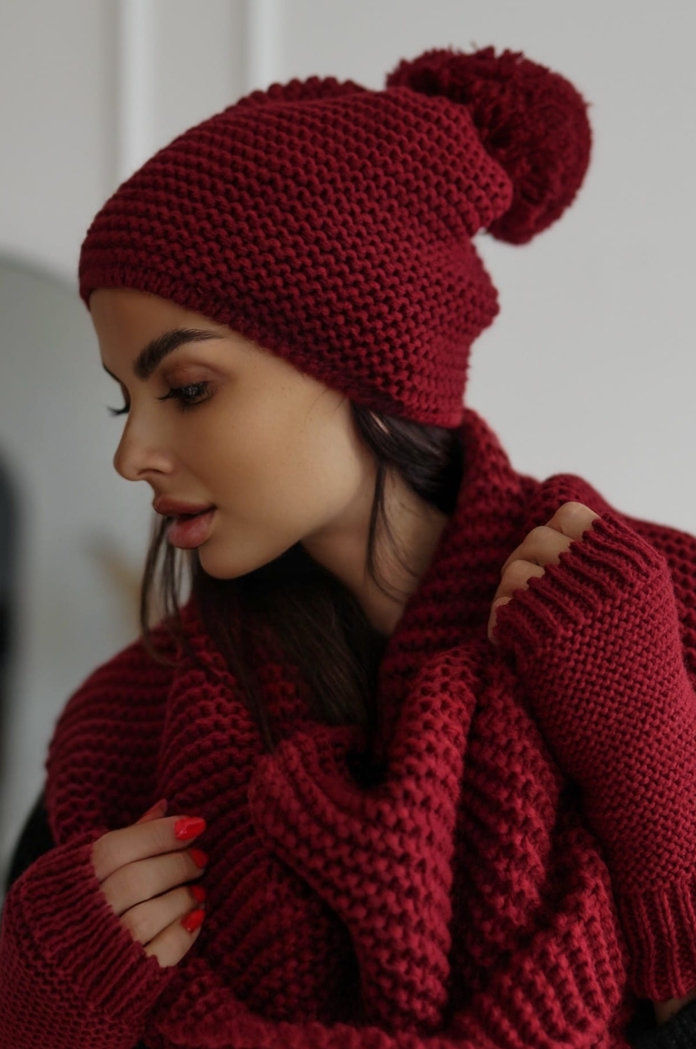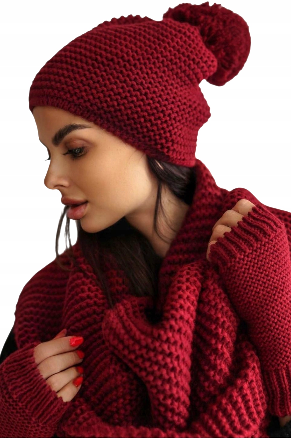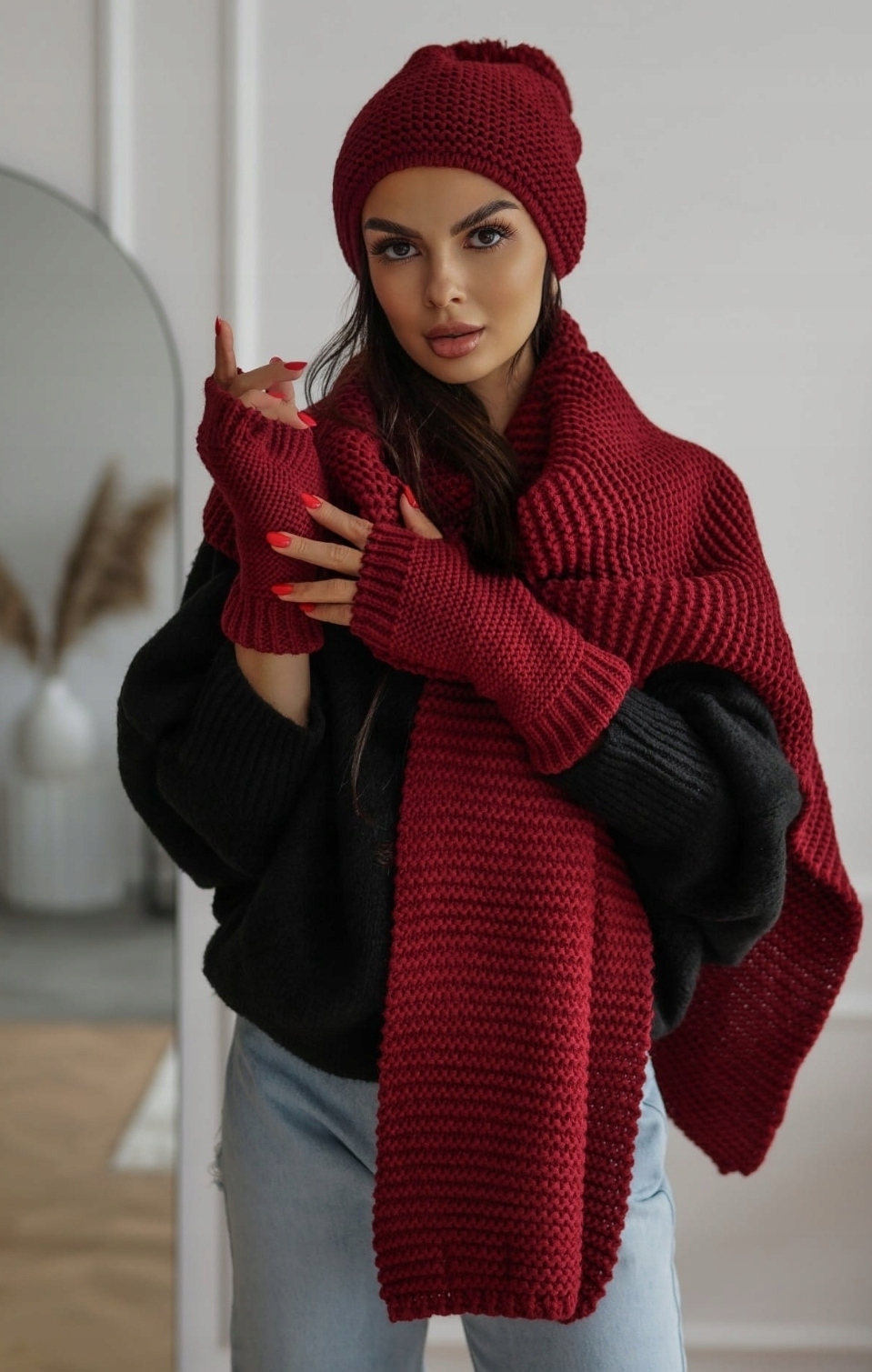 Zimowy komplet świetnie sprawdzi się w zestawienie ze skórzaną ramoneską, zimową kurtką lub płaszczem.