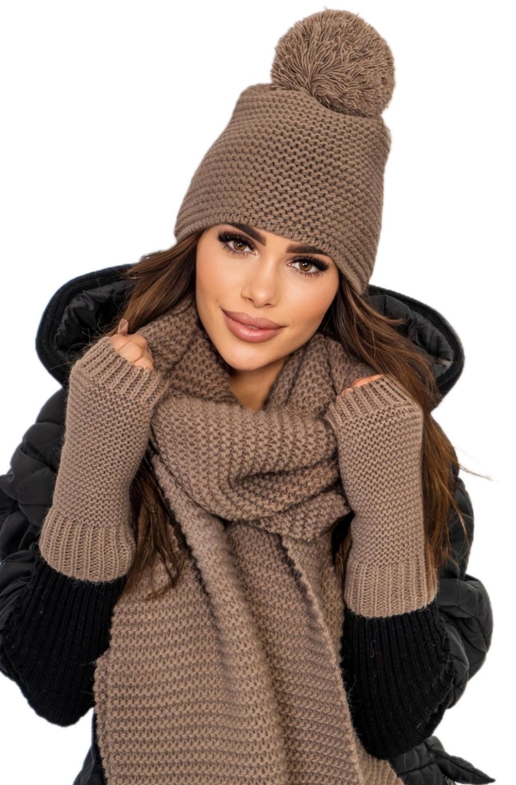 Zimowy komplet świetnie sprawdzi się w zestawienie ze skórzaną ramoneską, zimową kurtką lub płaszczem.