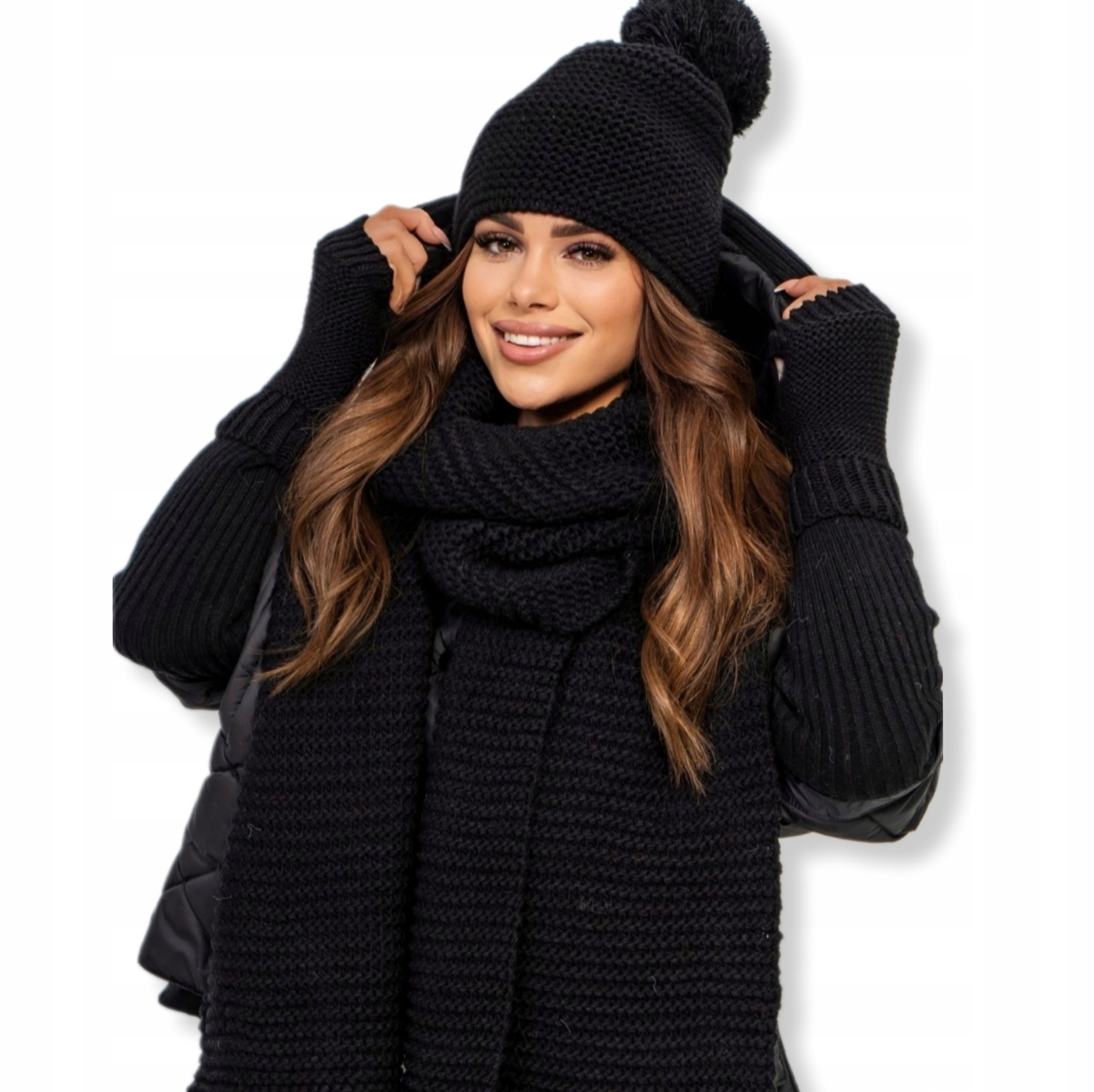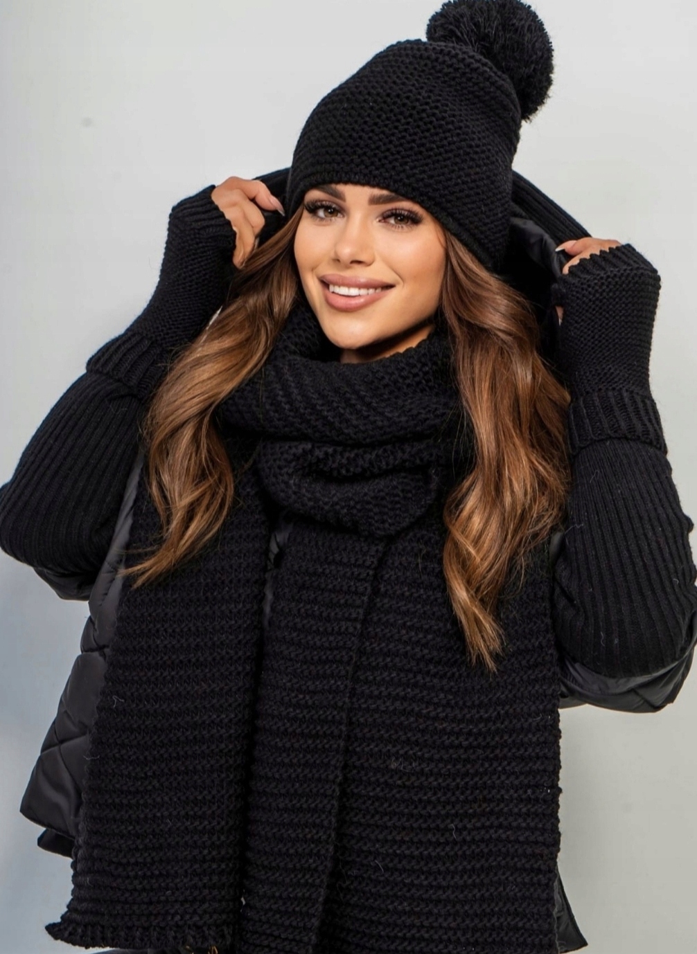 Zimowy komplet świetnie sprawdzi się w zestawienie ze skórzaną ramoneską, zimową kurtką lub płaszczem.
