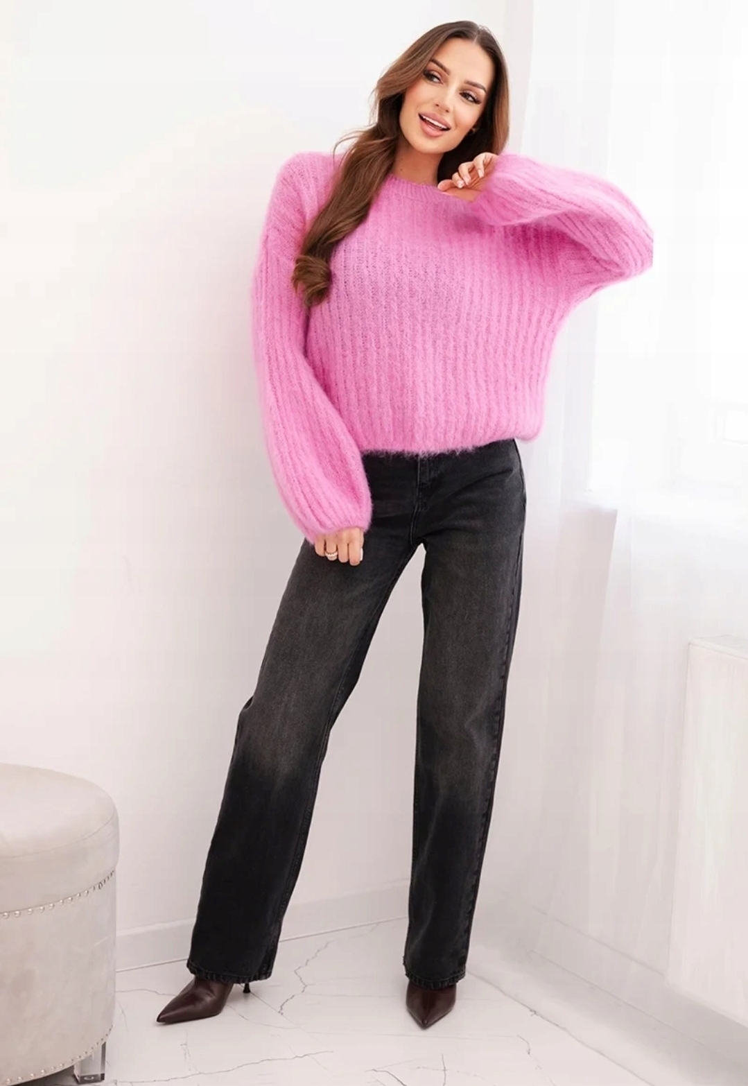 Włoski sweter moherowy o fasonie „dzwonek”, zachwycający lekkością i delikatną, puszystą strukturą. Model wyróżnia się modnie poszerzanymi rękawami, które nadają mu kobiecego charakteru i subtelnej elegancji. Miękki i przyjemny w dotyku, idealny do stylizacji na co dzień i na wyjątkowe okazje.