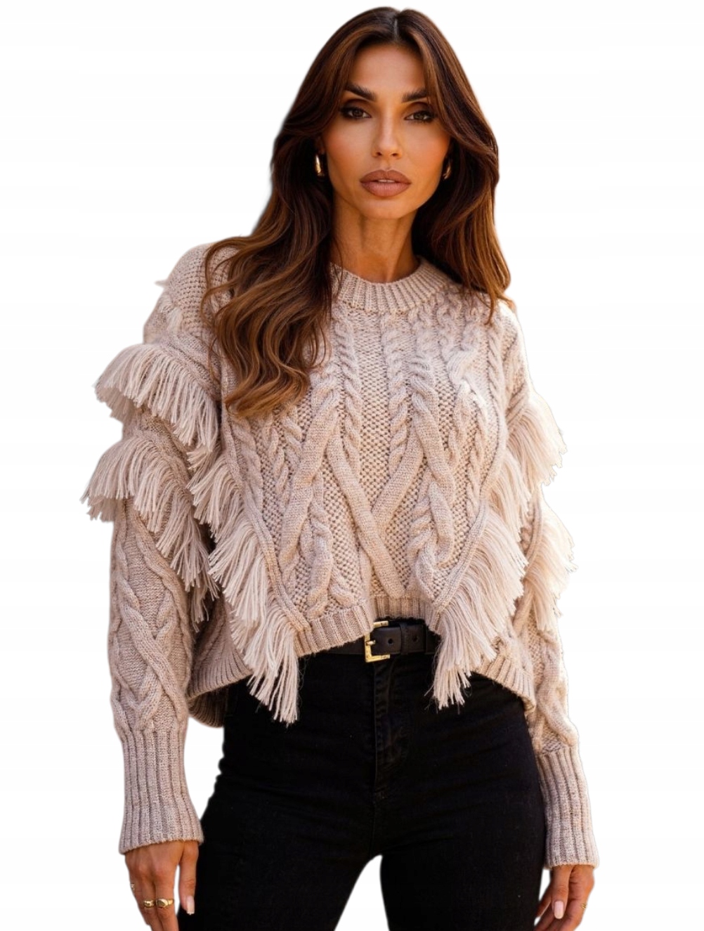 Postaw na modny i wyjątkowy styl! Ten luźny sweter z pięknymi frędzlami z przodu i z tyłu to propozycja dla kobiet, które lubią wyróżniać się w subtelny, elegancki sposób. Wykonany z miękkiej, przyjemnej w dotyku dzianiny, gwarantuje komfort i ciepło w chłodniejsze dni.