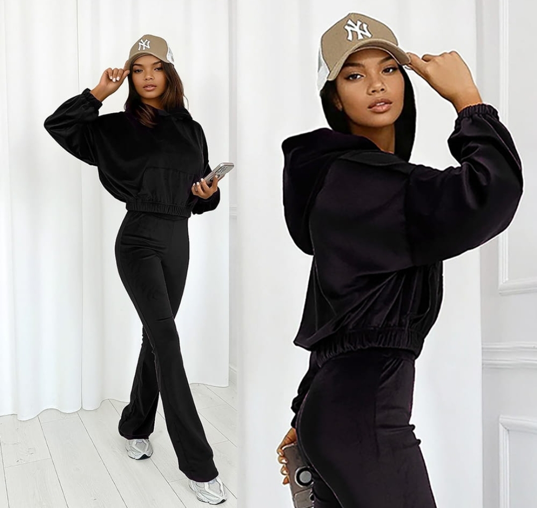 WELUROWY KOMPLET DRESOWY BLUZA Z KAPTUREM I SPODNIE DZWONY PREMIUM