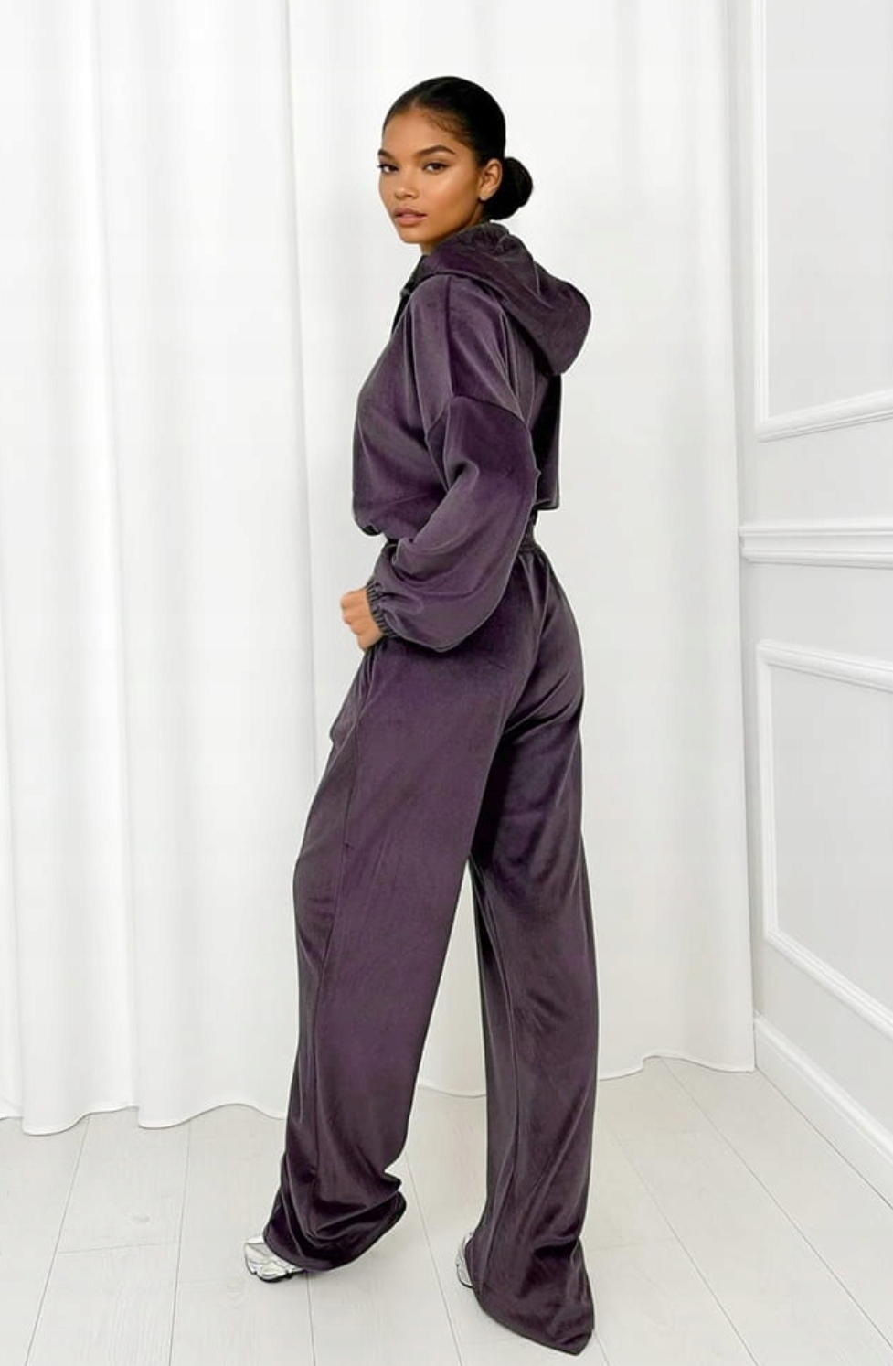 Wysokiej jakości welur o delikatnym połysku nadaje całości luksusowego charakteru, a elastyczna dzianina dopasowuje się do sylwetki i zapewnia pełną swobodę ruchów. Komplet doskonale sprawdzi się zarówno na co dzień – do domu, na spacer czy zakupy – jak i na casualowe wyjścia.