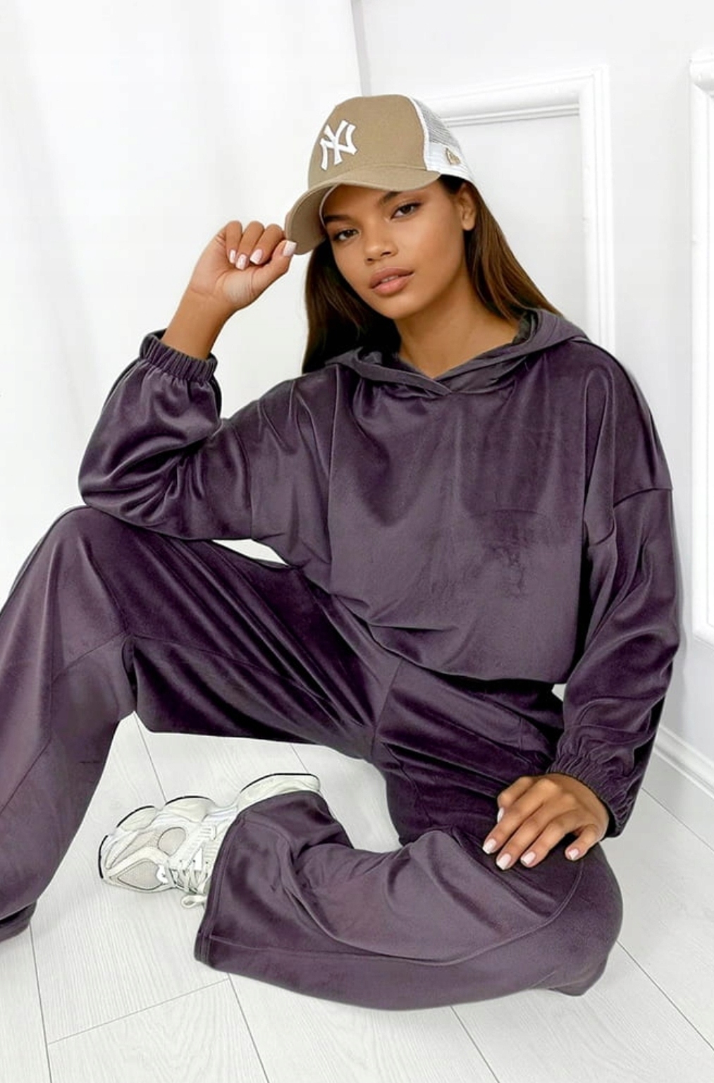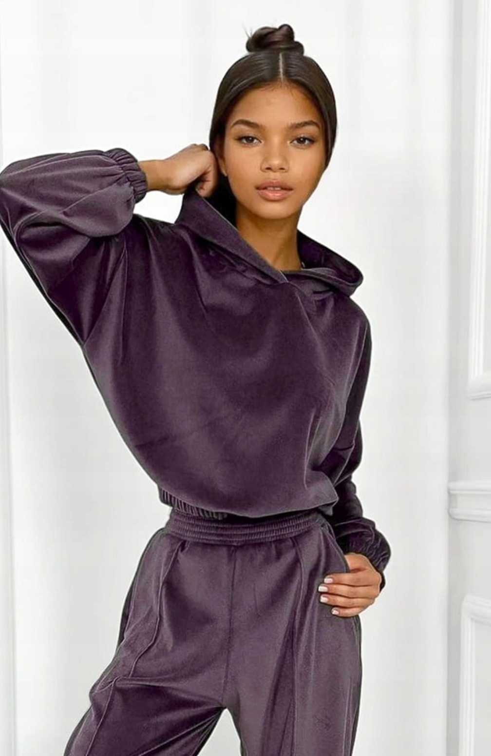 Wysokiej jakości welur o delikatnym połysku nadaje całości luksusowego charakteru, a elastyczna dzianina dopasowuje się do sylwetki i zapewnia pełną swobodę ruchów. Komplet doskonale sprawdzi się zarówno na co dzień – do domu, na spacer czy zakupy – jak i na casualowe wyjścia.