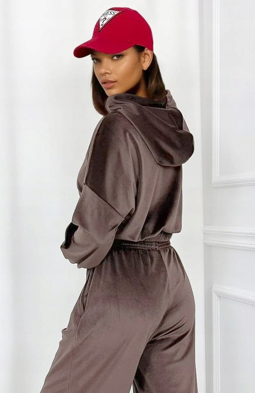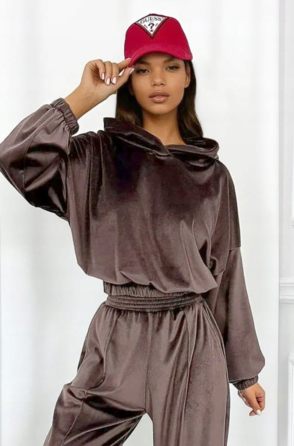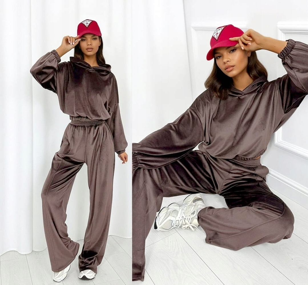 Wysokiej jakości welur o delikatnym połysku nadaje całości luksusowego charakteru, a elastyczna dzianina dopasowuje się do sylwetki i zapewnia pełną swobodę ruchów. Komplet doskonale sprawdzi się zarówno na co dzień – do domu, na spacer czy zakupy – jak i na casualowe wyjścia.