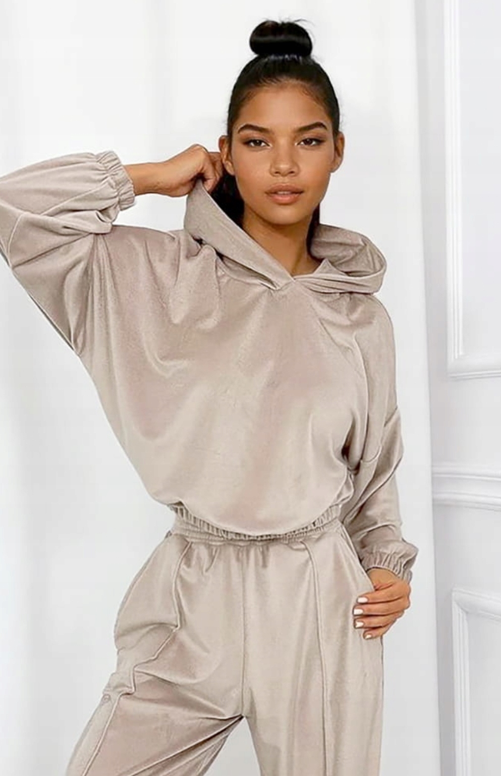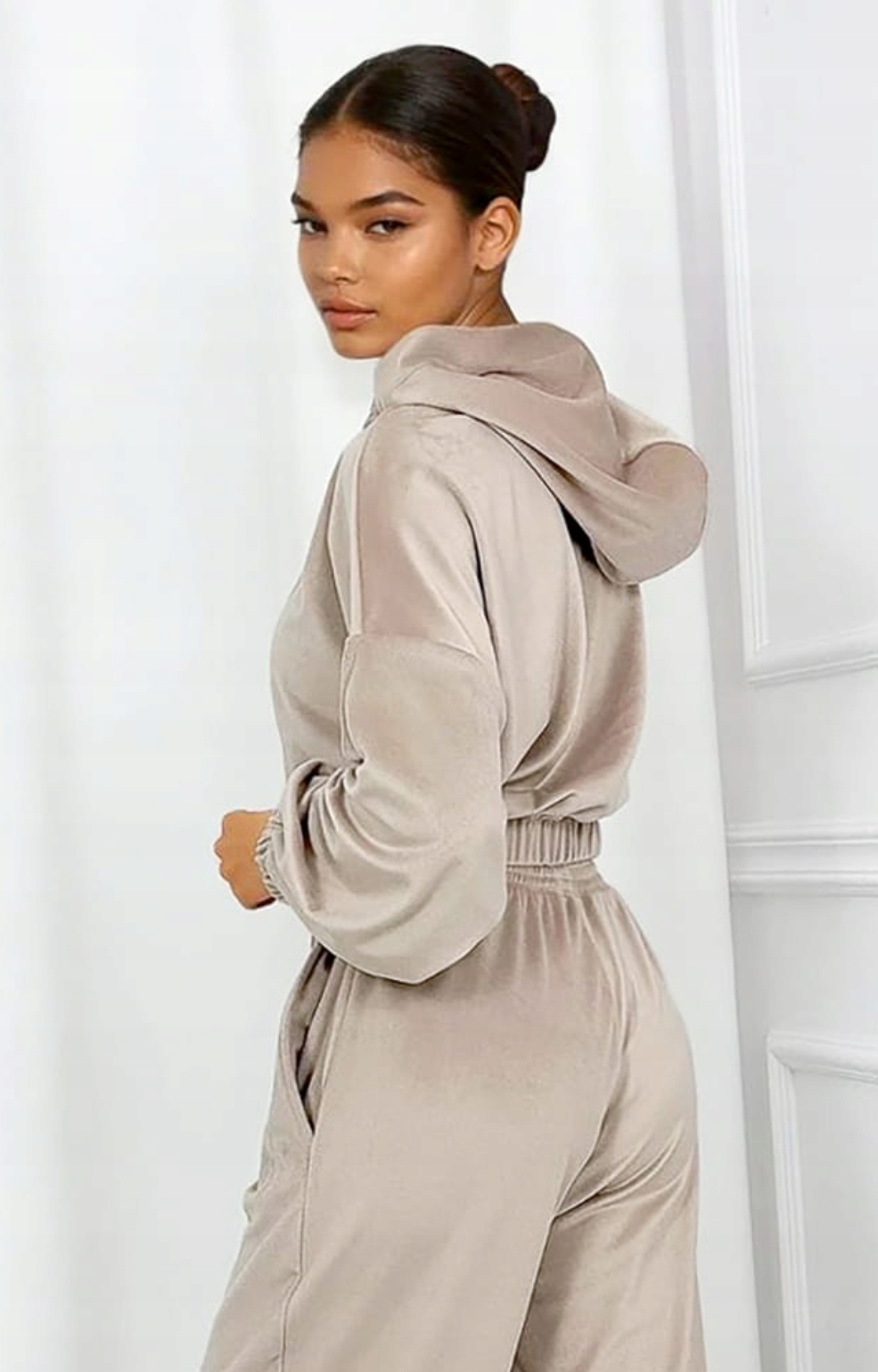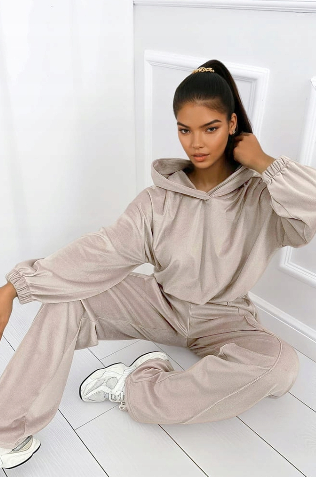 Wysokiej jakości welur o delikatnym połysku nadaje całości luksusowego charakteru, a elastyczna dzianina dopasowuje się do sylwetki i zapewnia pełną swobodę ruchów. Komplet doskonale sprawdzi się zarówno na co dzień – do domu, na spacer czy zakupy – jak i na casualowe wyjścia.