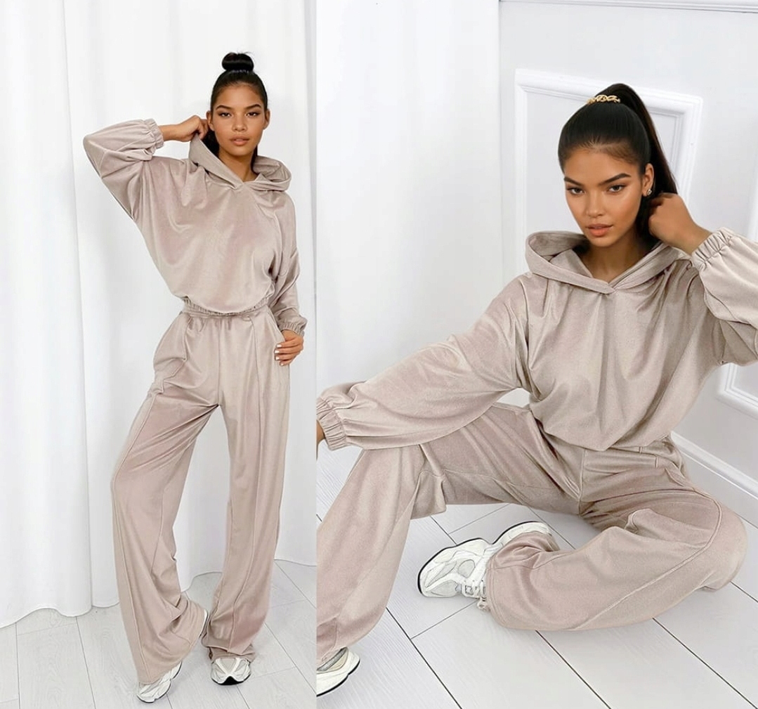 Poznaj stylowy welurowy komplet damski, który łączy maksymalną wygodę z modnym, kobiecym fasonem. Zestaw składa się z miękkiej bluzy z kapturem do pasa oraz szerokich spodni. To idealna propozycja dla kobiet ceniących komfort, ale nie rezygnujących z eleganckiego wyglądu.